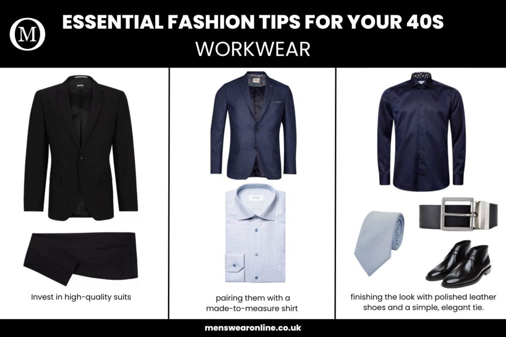 Dressing for the office in your 40s is all about presenting a polished and professional image. Invest in a few high-quality suits that can be rotated throughout the week. Brands like Hugo Boss and Canali offer suits that are both classic and modern, ensuring a sharp appearance.