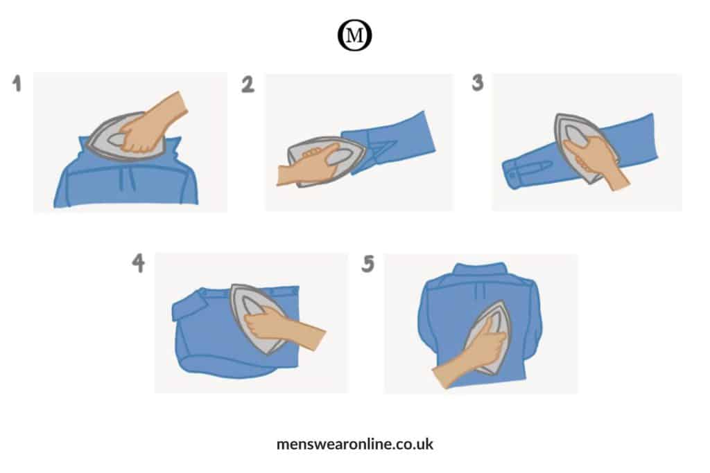 – The general order to iron a shirt: start with the collar and cuffs, then move on the sleeves, shoulders, and front panels, finishing with the back. Don’t forget to revisit any areas that might have creased during ironing.
