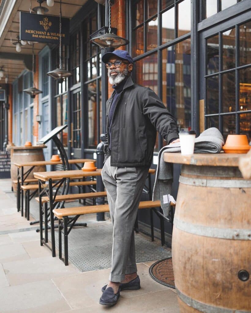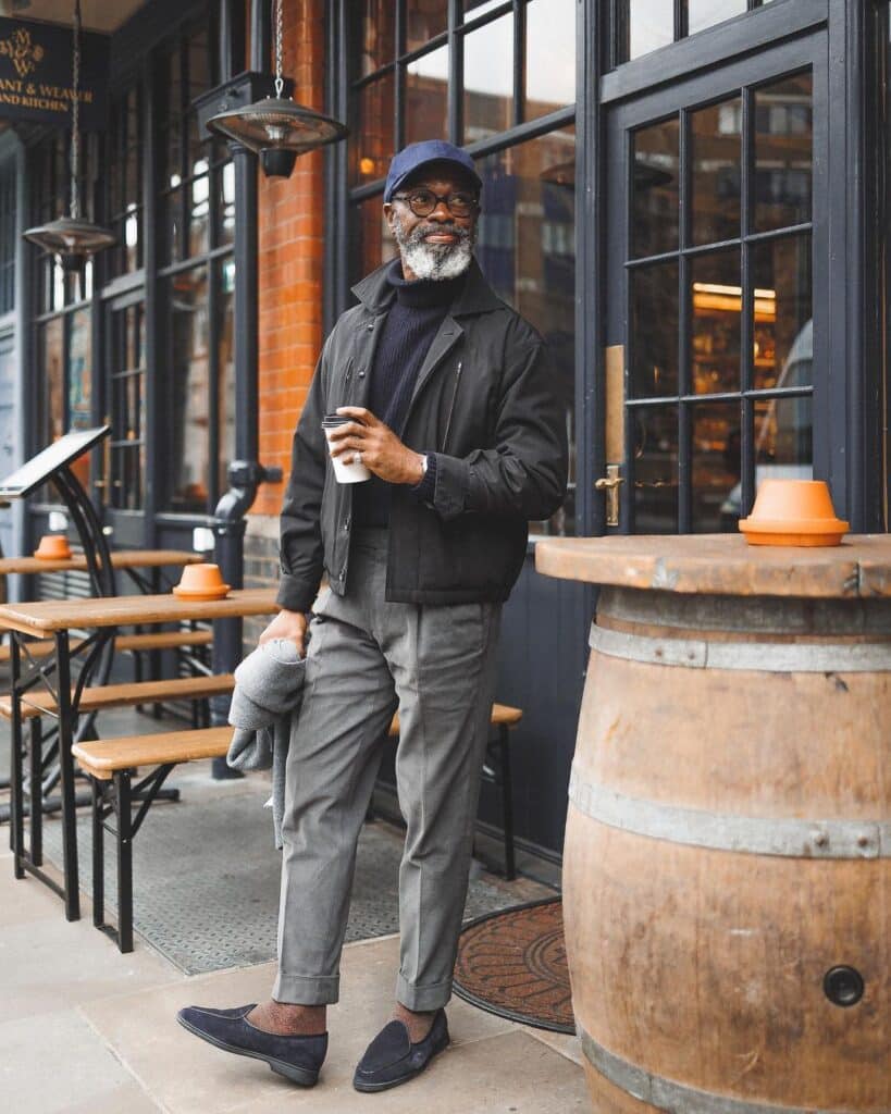 The bomber jacket and rollneck combo is currently in fashion, creating a modern and stylish look. Shades of grey, charcoal, and black give a sophisticated and neat appearance. This outfit is versatile and can be worn for different St. Patrick’s Day occasions, from casual pub gatherings to slightly more formal dinners.