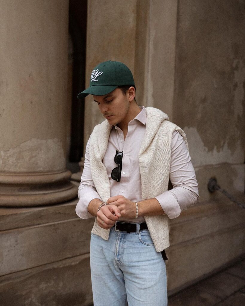 This outfit is perfect for a casual gathering at a pub or a house party. The light-washed jeans and beige cardigan create a warm and comfortable atmosphere, while the black belt and sunglasses add a stylish touch. The green cap is a subtle nod to St. Patrick’s Day, without being too over-the-top.