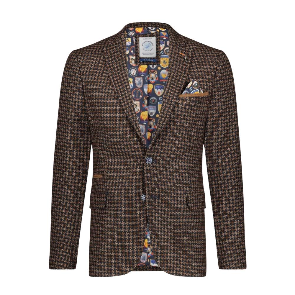 A Fred twist on a classic patterned beige jacket! woven finish with a two-button fastening, contrast stitching on the button holes, decorative buttons on the sleeves, a double slit at the back, a breast pocket. Lots of colour on the inside, the jacket is lined with ski theme print!