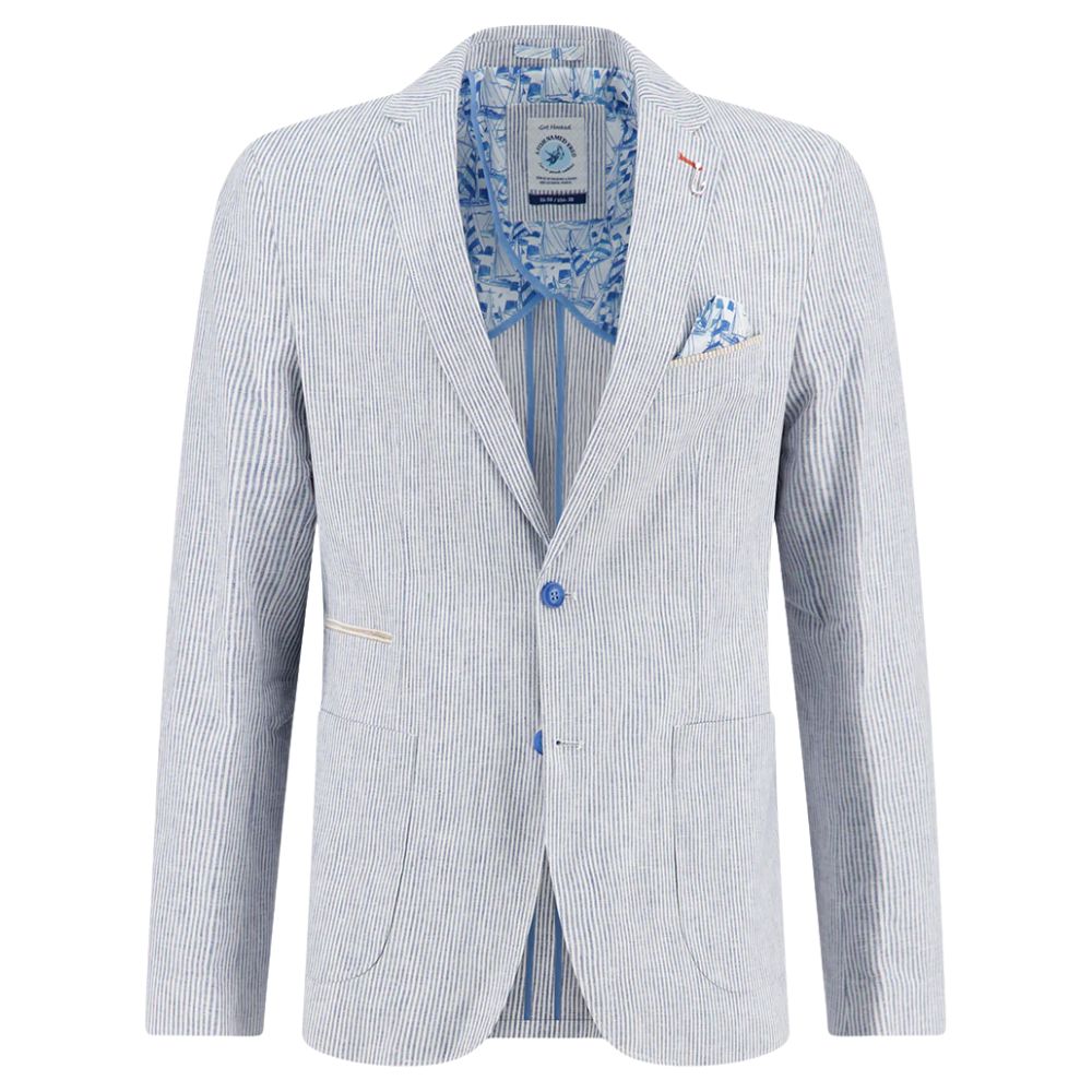 The Blazer Linen Stripe by Fish Named Fred features a cool cobalt tone with subtle stripe detailing for a bold yet refined look. Made from lightweight linen, it offers breathable comfort and a tailored fit, making it a standout choice for smart-casual summer occasions.