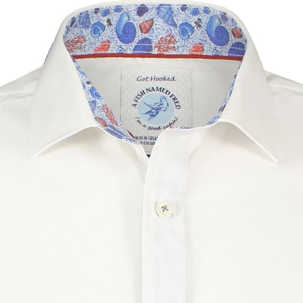 A Fish Named Fred has some of the most gifted designers and stylists in its creative team. A lot of time and attention goes into every detail of the collection from concept to finish. This white shirt features coral detailing in the collar and cuffs, great to impress that special person. Made from cotton giving you that breathable feel when wearing.