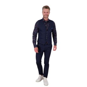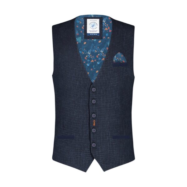 Refine your wardrobe with A Fish Named Fred navy waistcoat, featuring a subtle small check pattern for a refined, modern style. The real standout is the quirky lining adorned with a forest flower design, adding a unique and artistic touch to your outfit. Perfect for both formal and casual occasions, this waistcoat blends sophistication with personality.
