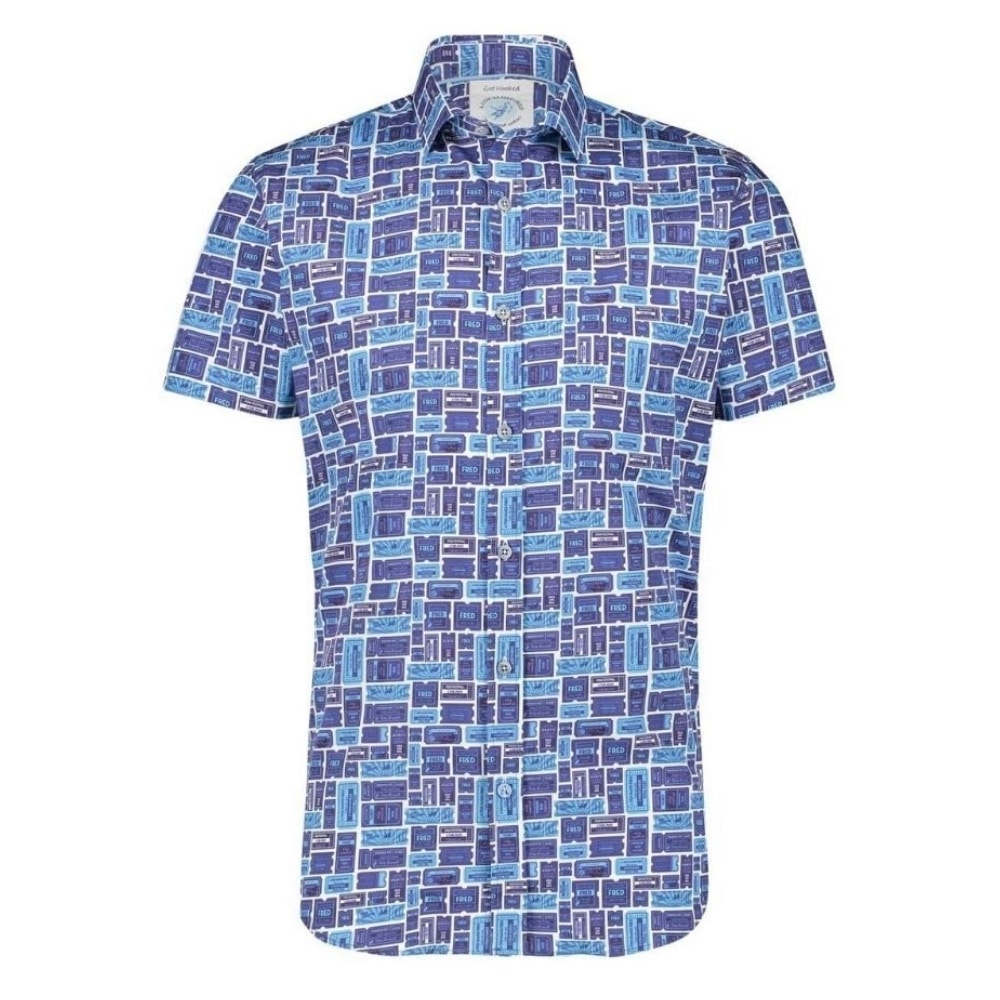 This printed shirt by A Fish Named Fred is a ticket to winning summer style! Featuring a cool graphic print of blue tickets in cool shades of blue , this short sleeve shirt is a fun and quirky addition to the wardrobe as temperatures rise. Made with a stretch cotton for comfort and detailed with fish scale buttons for a distinctive touch.