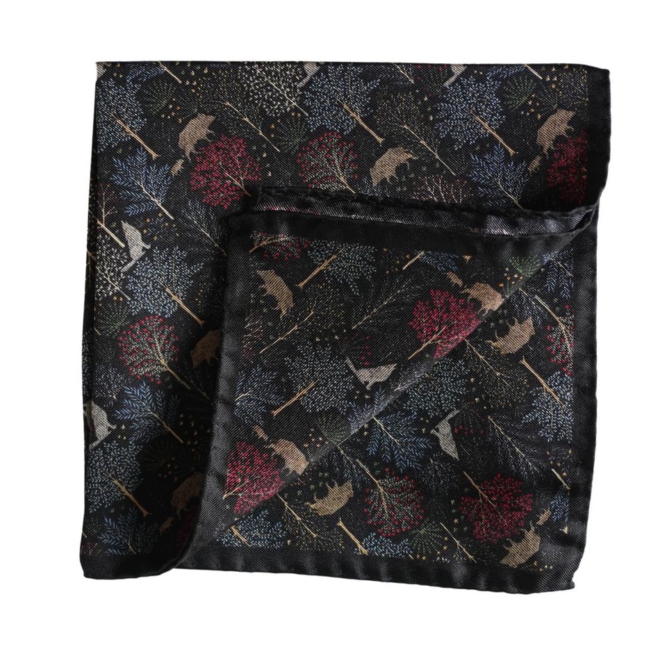 Amanda Christensen Classic printed black pocket square in forest trees twill background.