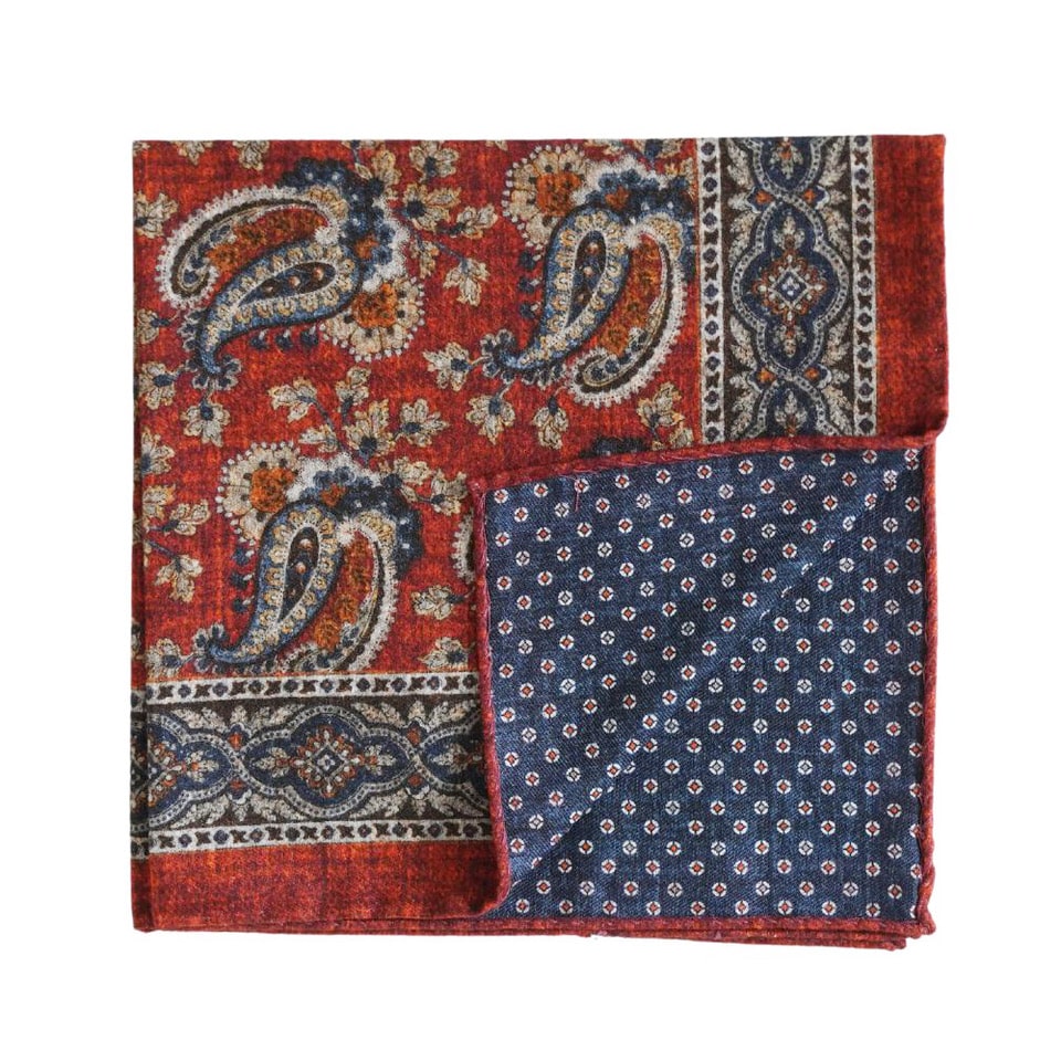 Amanda Christensen Classic printed red pocket square paisley & micro pattern cotton background.