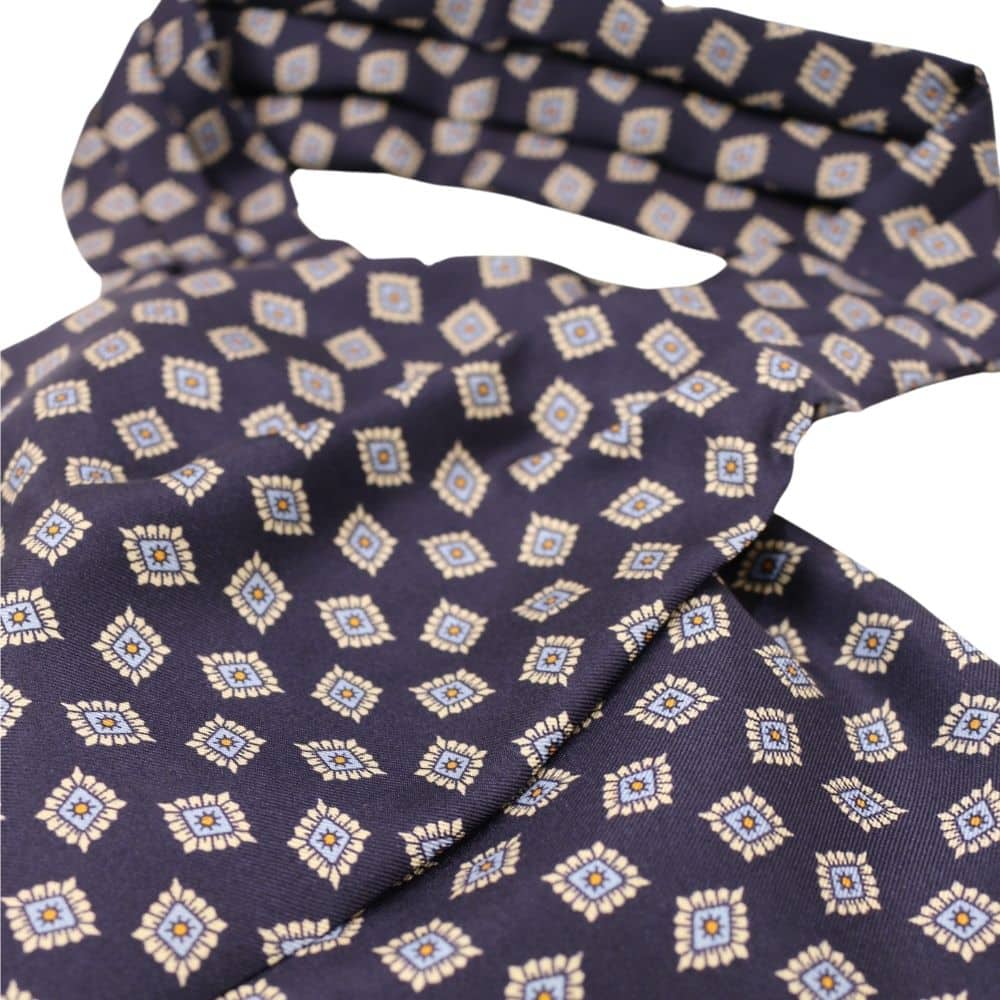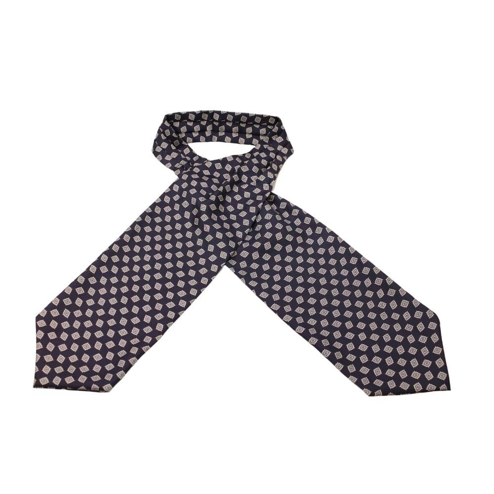 Amanda Christensen Navy Cravat made from silk and featuring contrasting diamond shaped flowers printed all over. Wear this cravat with one of our shirts as part of a great outfit for formal, sporting or casual occasions.