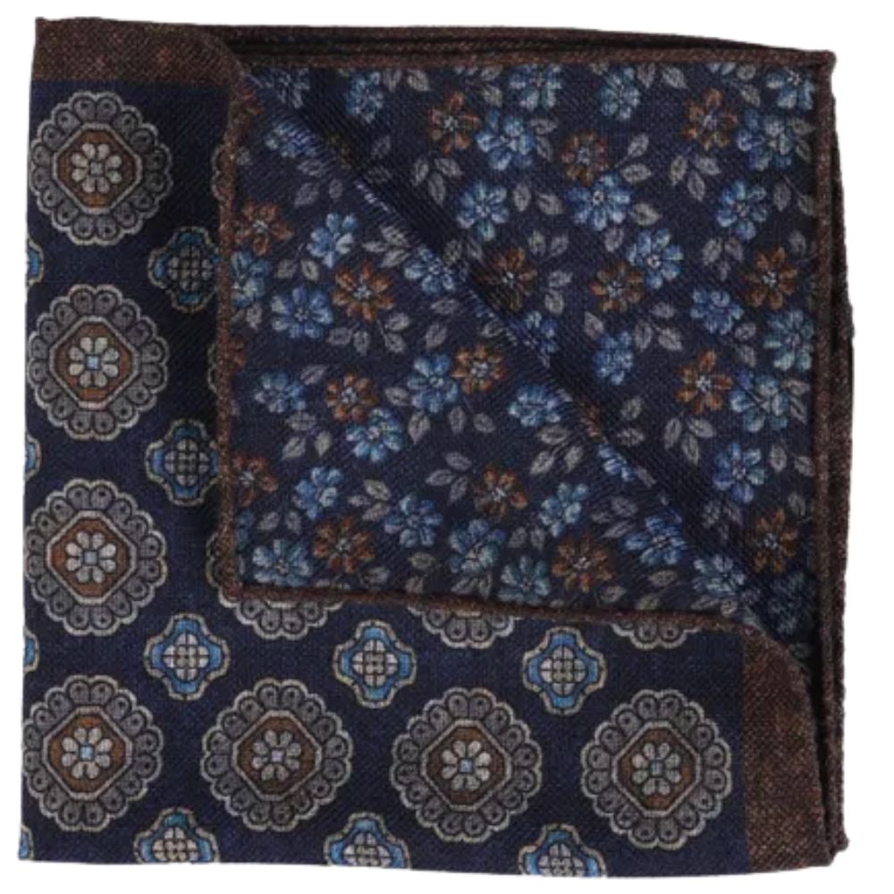 This navy pocket square is A refined accessory with versatile styling options. One side features an intricate floral pattern, while the reverse presents a simpler, bolder design, both in rich navy tones. Perfect for adding depth and character to tailored looks.