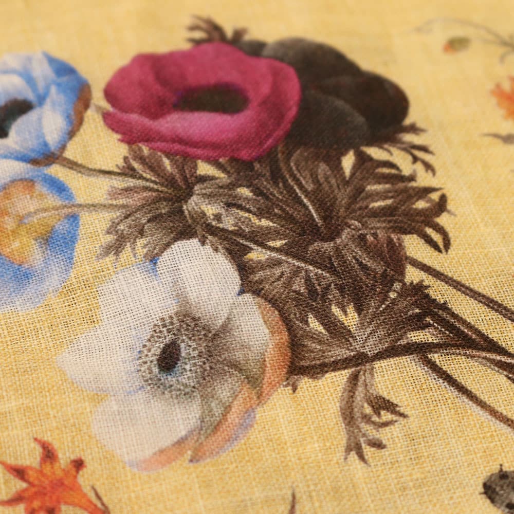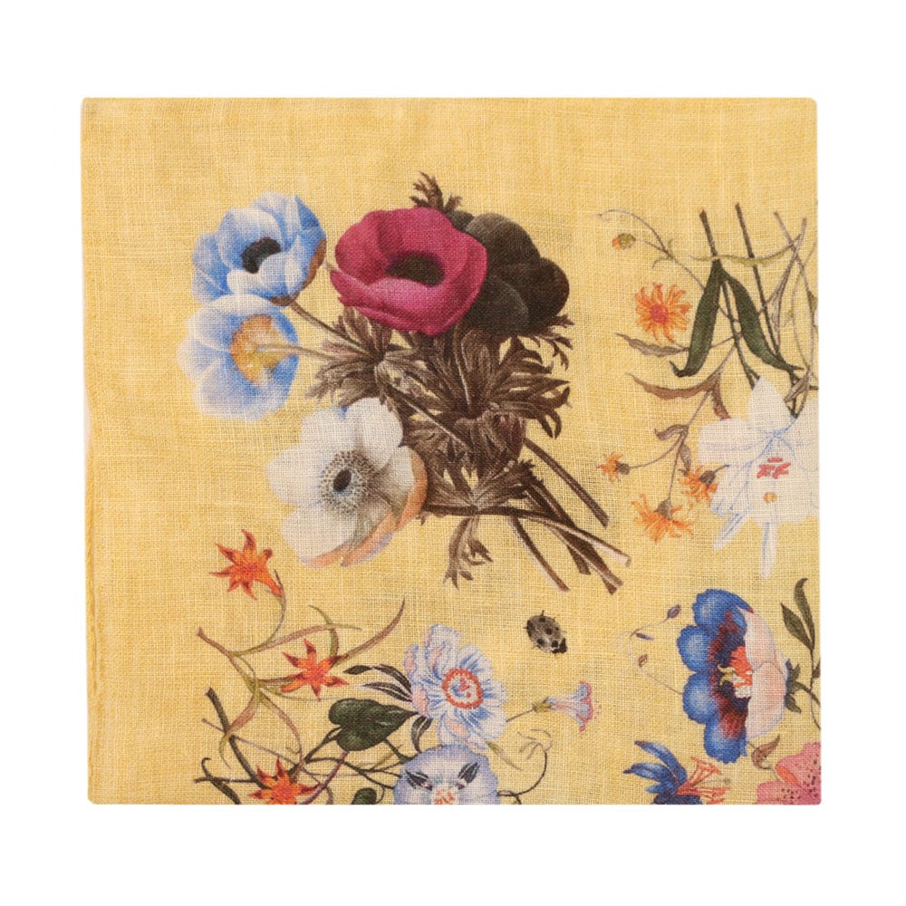 Amanda Christensen Flower Graphic Pocket Square in Yellow, featuring a textured silk fabric in pastel colour with a printed graphic of flowers and plants. Add this pocket square to one of our suits or smart blazers for a complete and well appointed smart look.