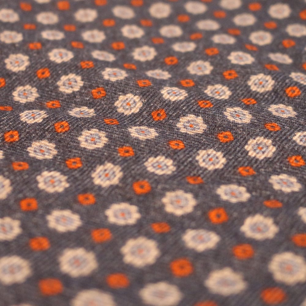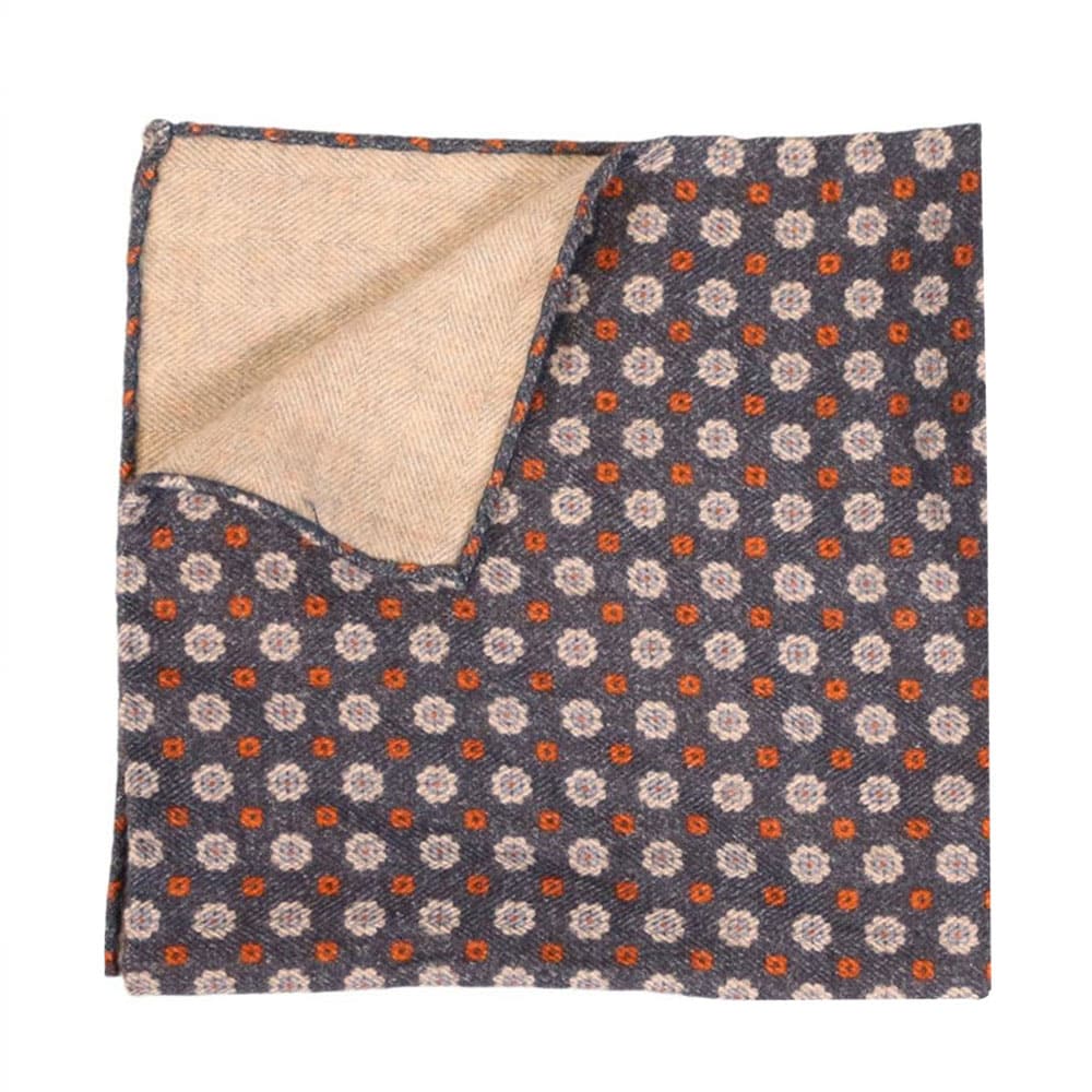 Amanda Christensen Flower Herringbone Pocket Square in Navy/Creme, featuring a wool herringbone fabric with a flower pattern on one side and a solid colour on the reverse