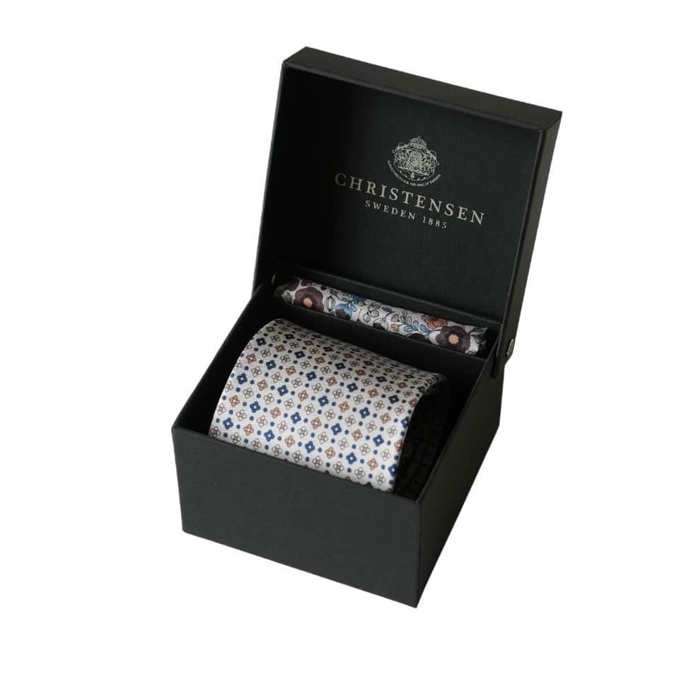 The Amanda Christensen tie and pocket square cox set, features a white tie with a flower print and a pocket square with a contrast pattern. A great gift and accompaniment to a formal outfit, this box set will add a fresh spring of colour and detail to a dapper look.