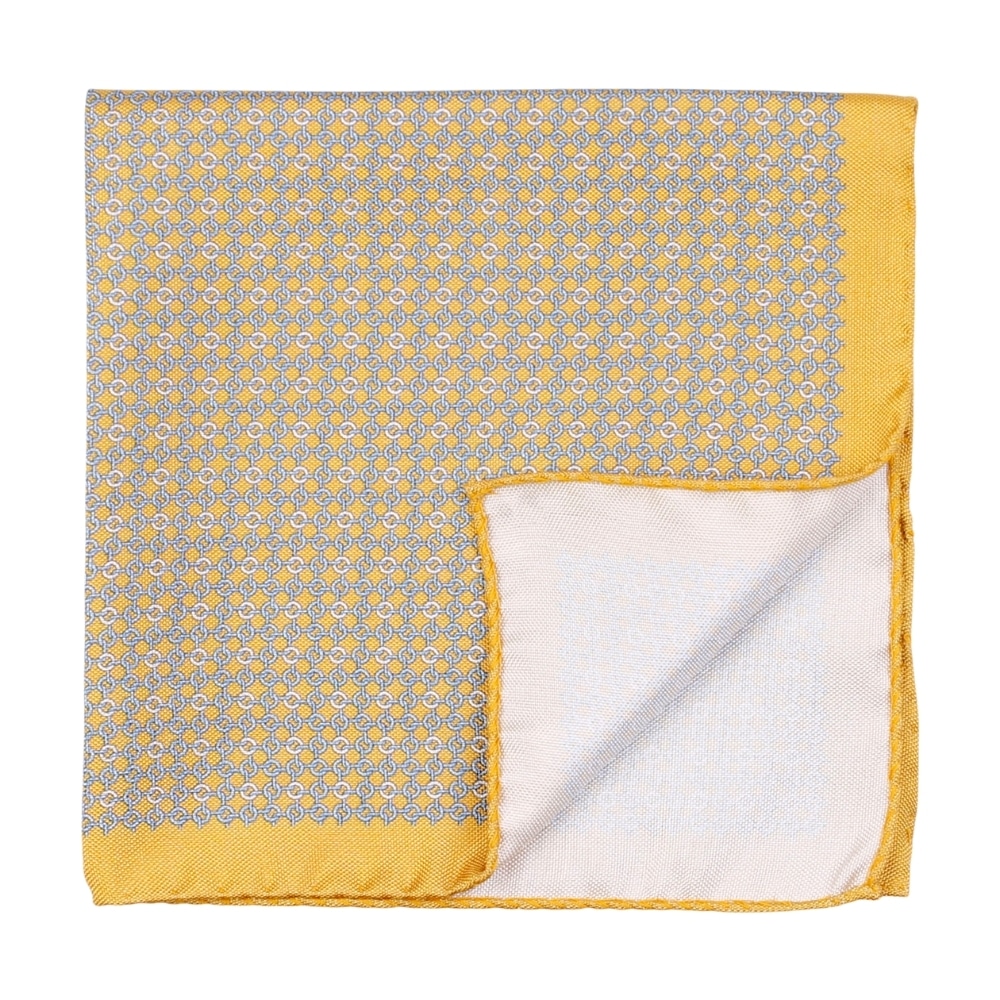 Amanda Christensen pocket square in gold, featuring a cartoon graphic of chains. Add this pocket square to one of our suits or smart blazers for a complete and well appointed smart look.