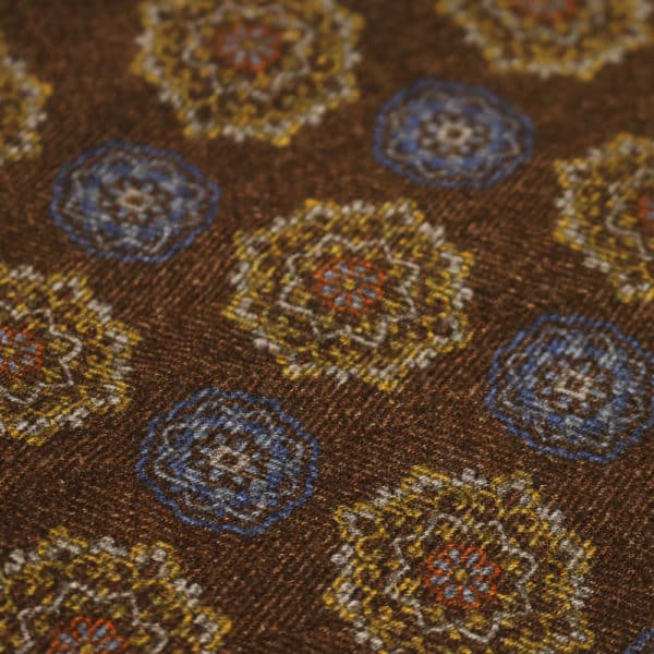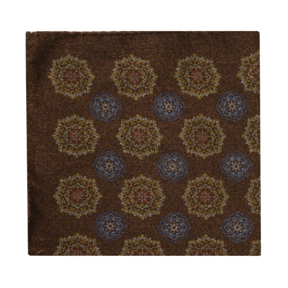 Amanda Christensen Brown Herringbone Medallion Pocket Square featuring a herringbone wool fabric with floral medallions. Add this pocket square to one of our suits or smart blazers for a complete and well appointed smart look.