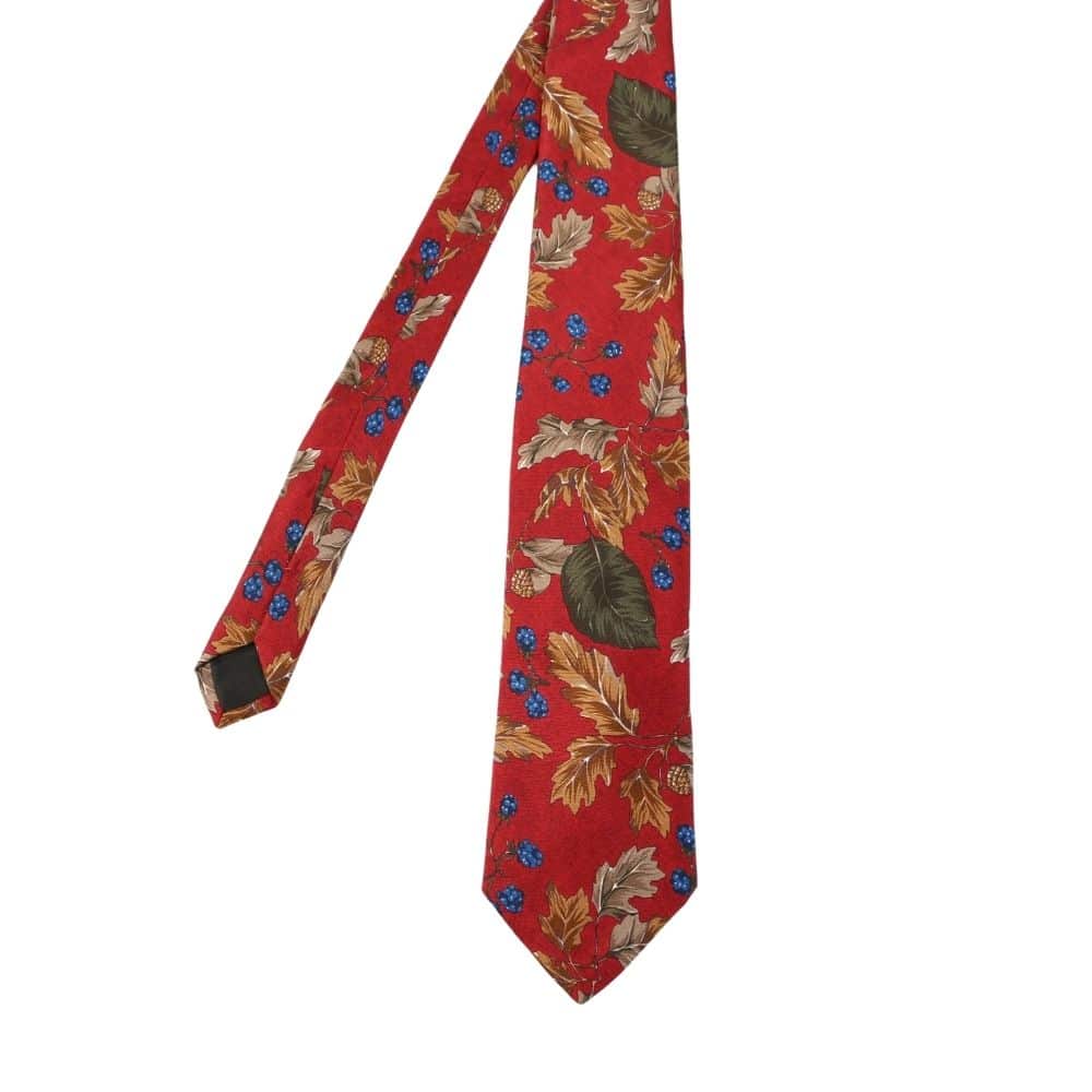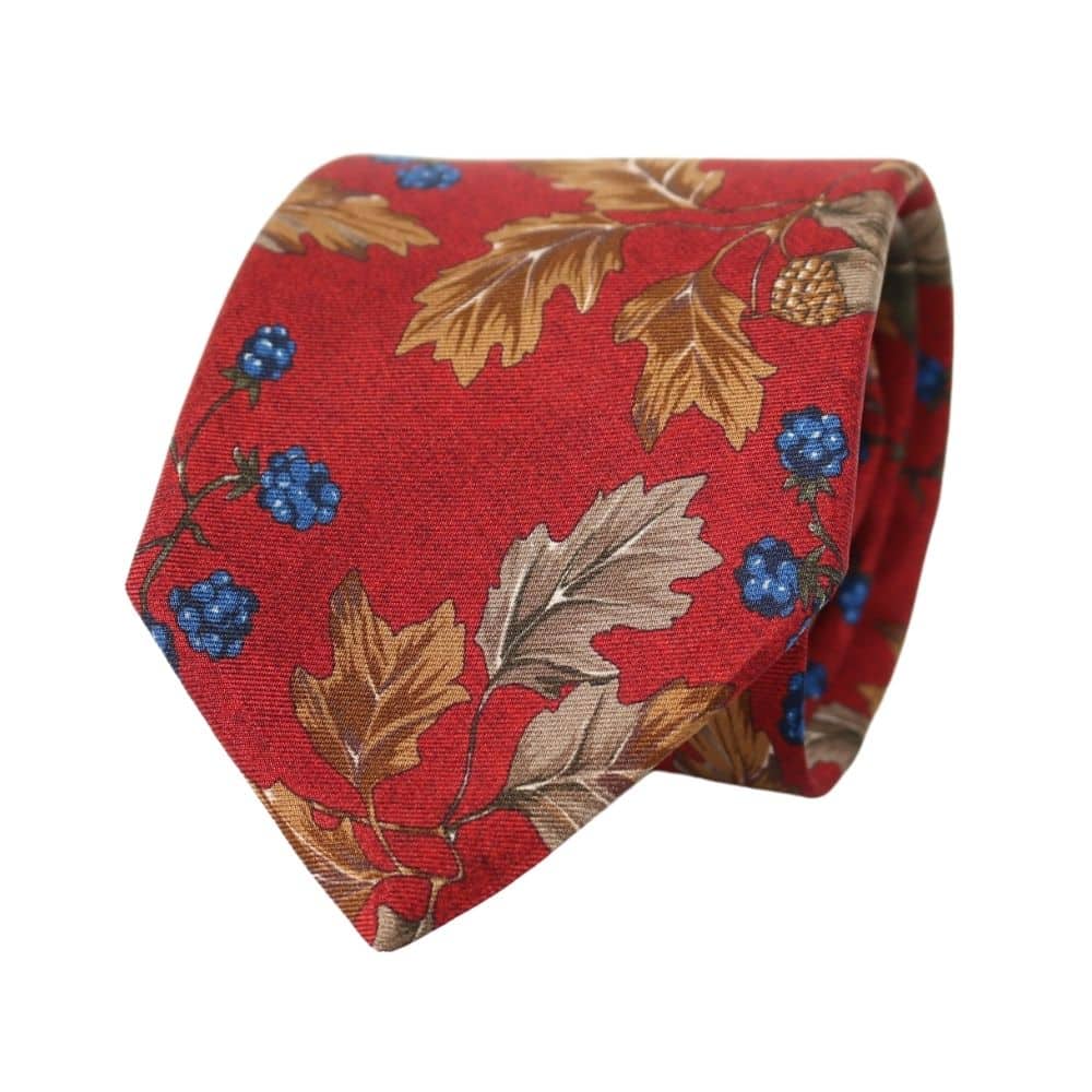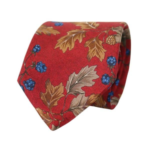 The Amanda Christensen Red Leaves and Berries Tie features a print of yellow and green leaves, as well as blue coloured berries. Perfect to add heritage country detail to smarter attire.