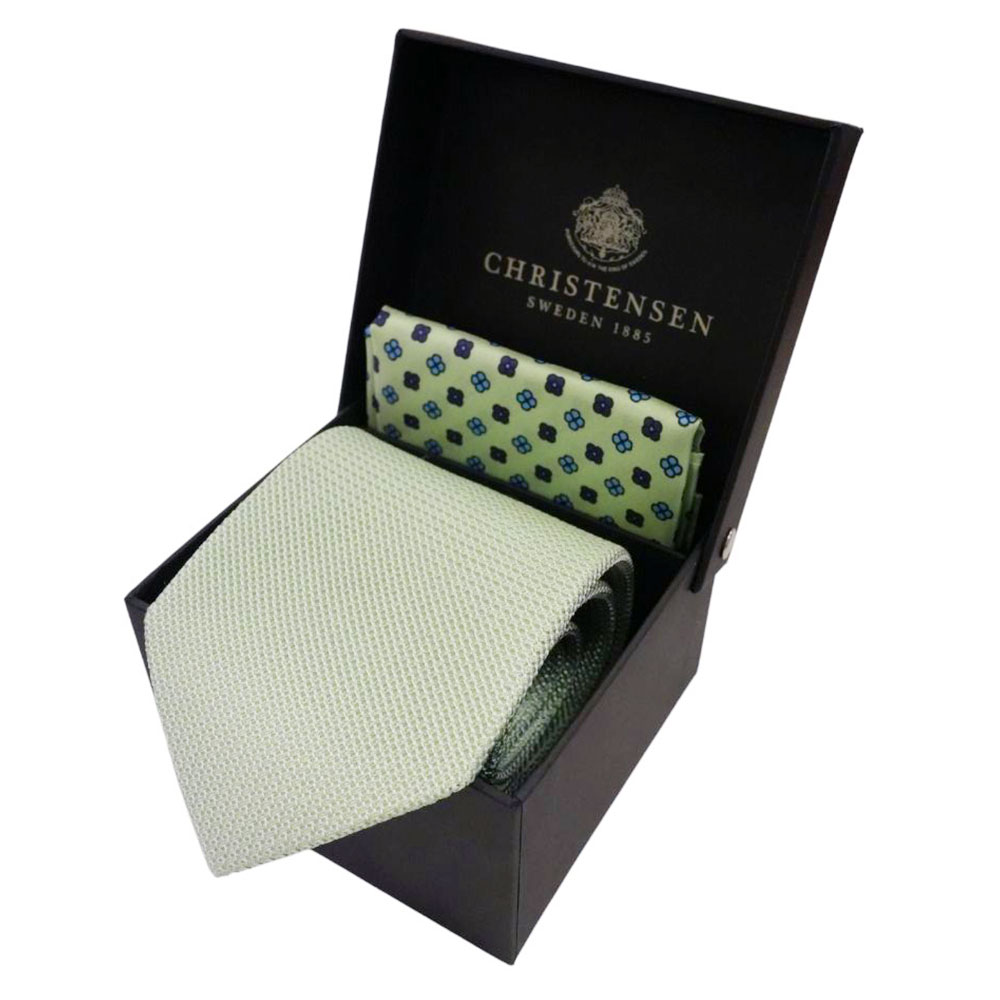 The Amanda Christensen Tie & Pocket Square Box Set is the perfect addition to your formal wardrobe. This set includes a classic printed tie with a light green tie and a patterned pocket square featuring an elegant design on twill. Together, they offer a stylish, coordinated look that adds a touch of sophistication to any ensemble.