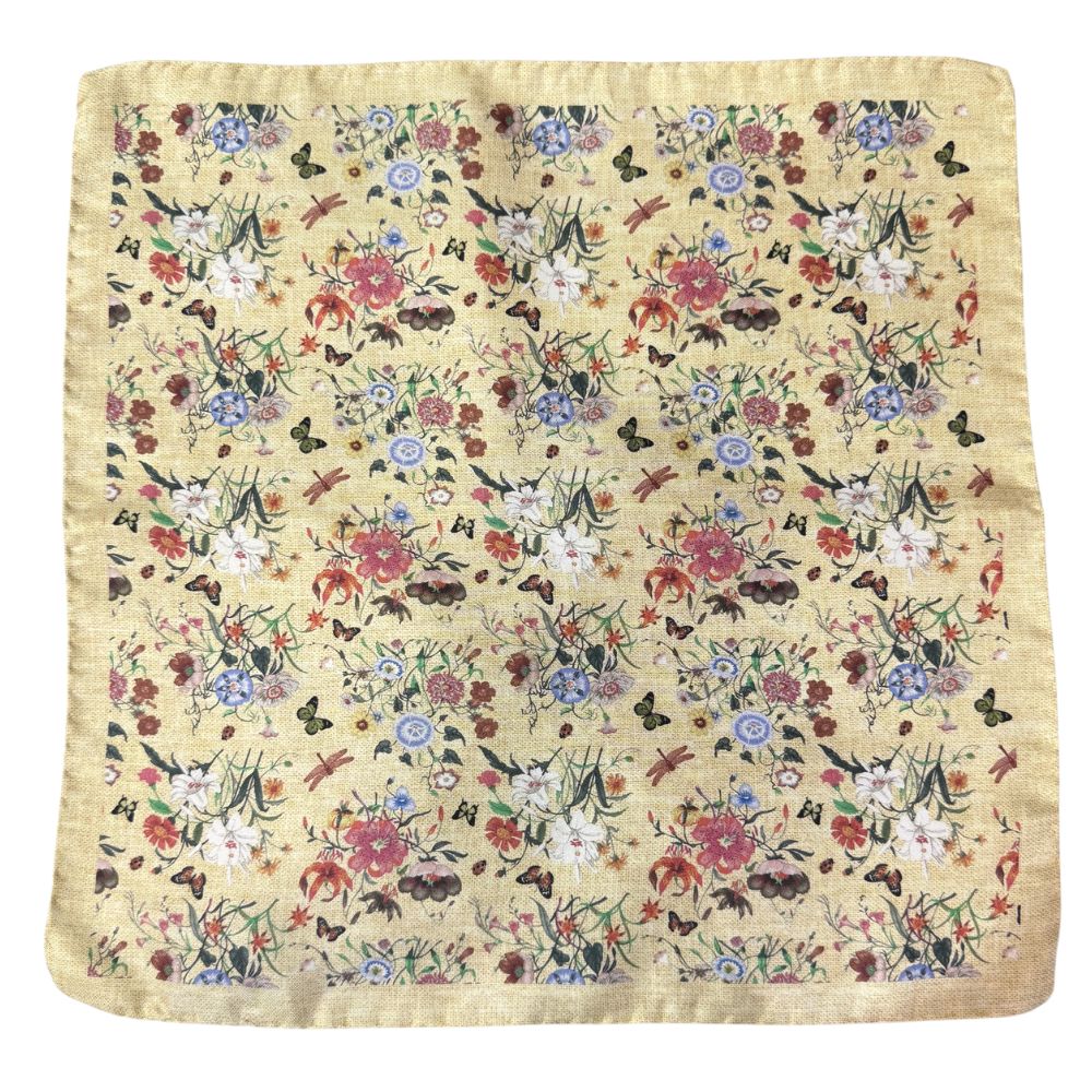 Amanda Christensen Classic printed Blue pocket square in flower & animal & plain mélange border with mélange twill ground.