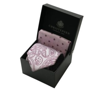 The Amanda Christensen tie and pocket square box set, features a pink tie with a paisley print and a pocket square with a contrast pattern. A great gift and accompaniment to a formal outfit, this box set will add a fresh spring of colour and detail to a dapper look.