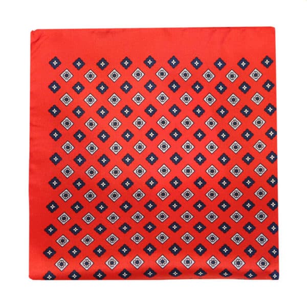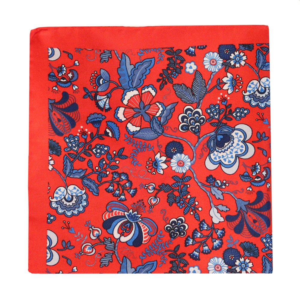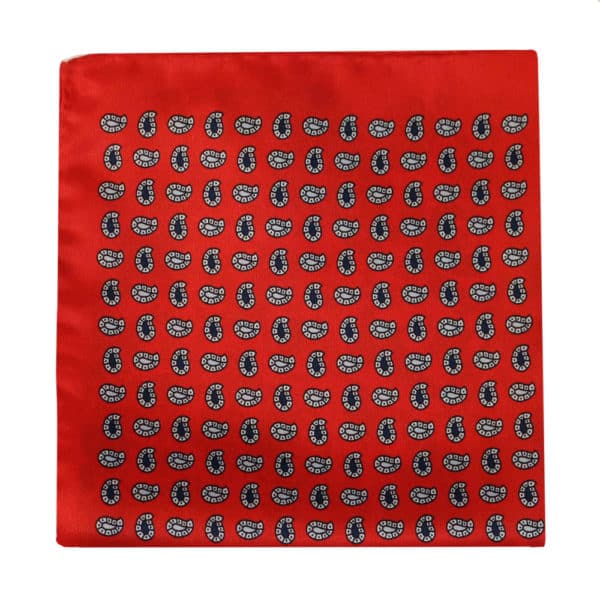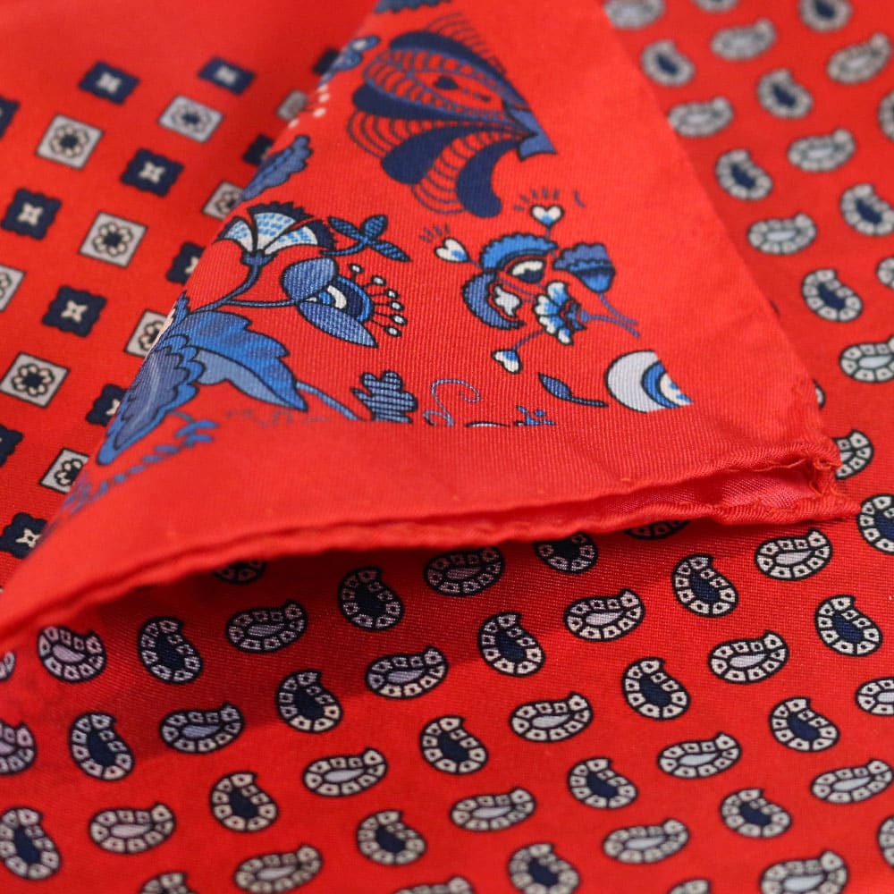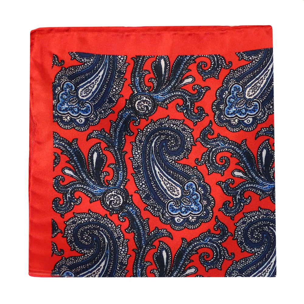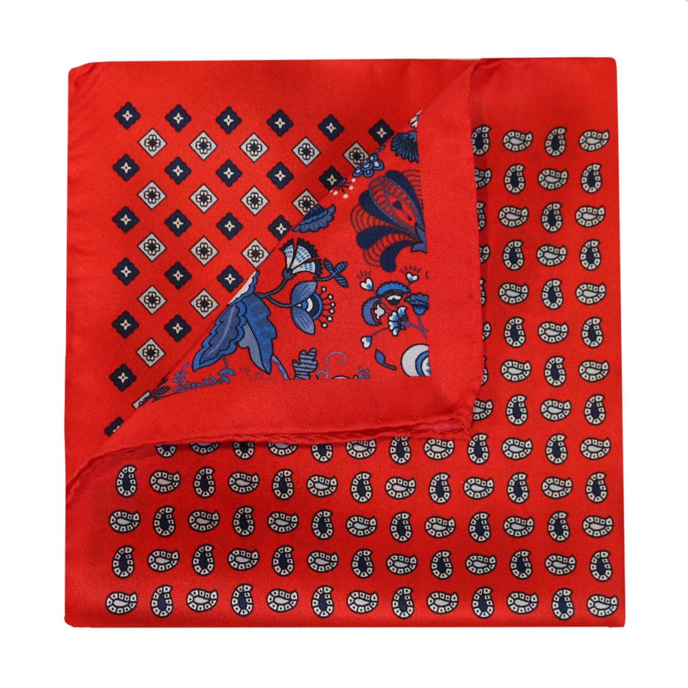 Amanda Christensen Red Quartered Pocket Square featuring quarters with large intricate paisley floral patterns, small diamond and paisley shapes. Add this pocket square to one of our suits or smart blazers for a complete and well appointed smart look.