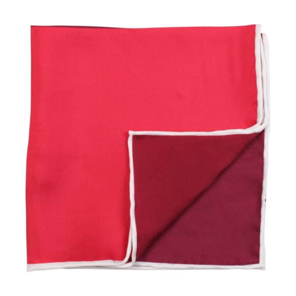 Amanda Christensen silk pocket square in red with white piping. Add this pocket square to one of our suits or smart blazers for a complete and a well appointed smart look.