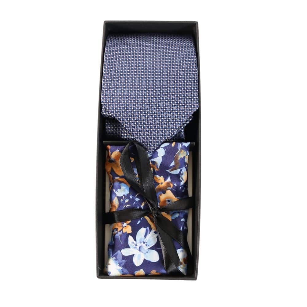 The Amanda Christensen Tie Box Set in Blue features a tie in a light blue with a square texture, as well as a pocket square with floral print. A great gift and accompaniment to a formal outfit, this box set will add a fresh spring of colour and detail to a dapper look.