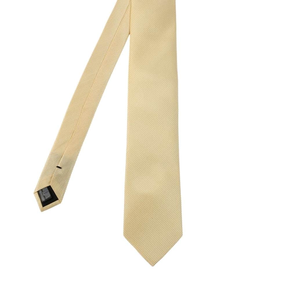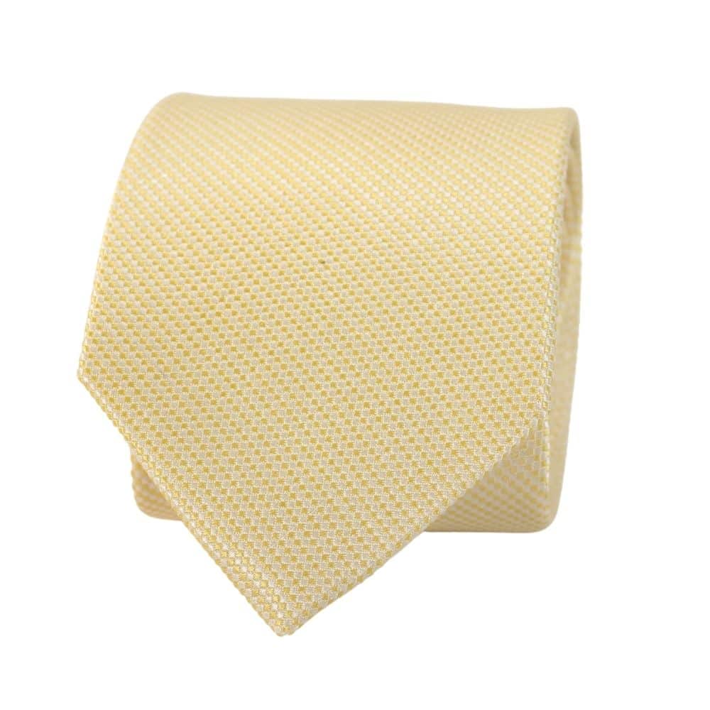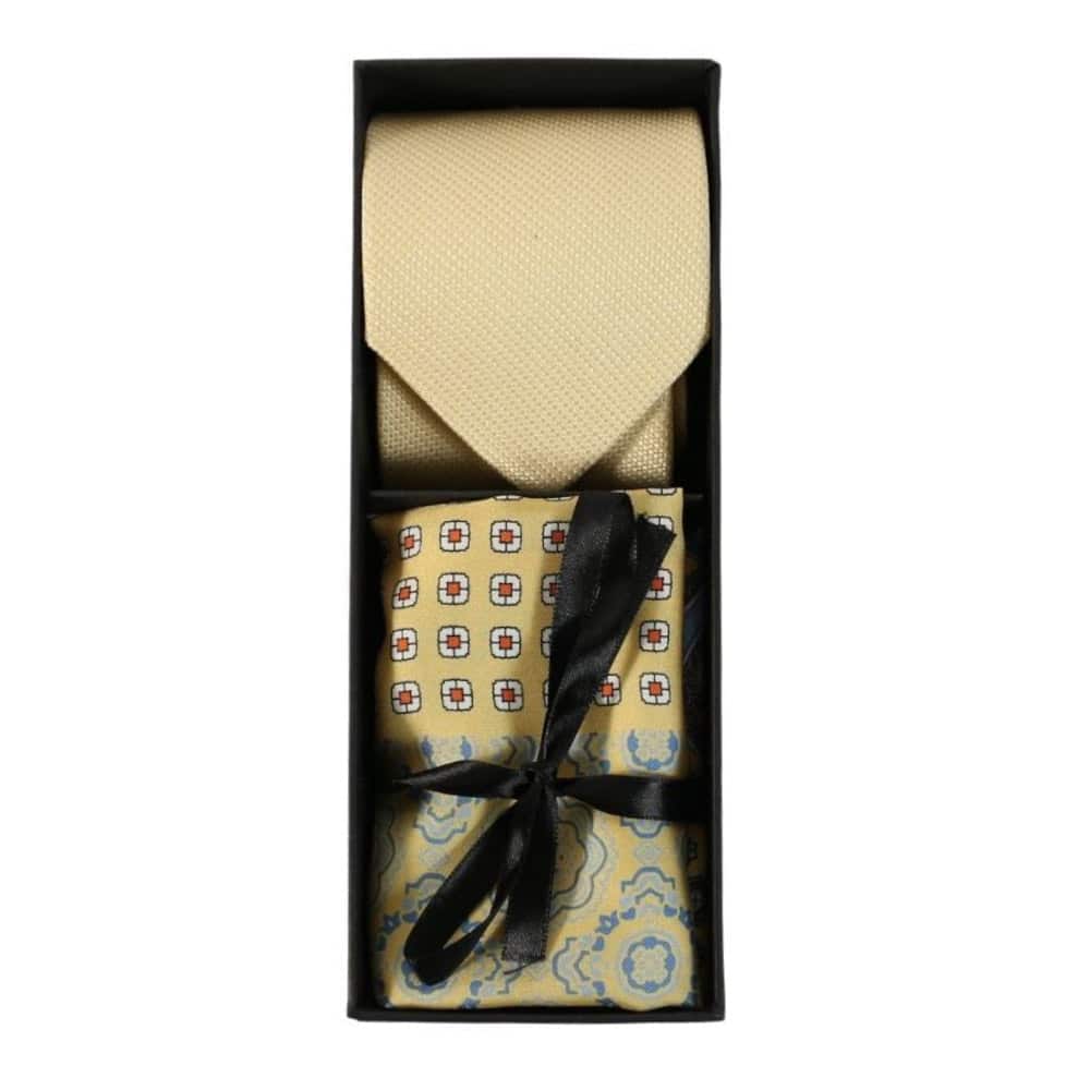 The Amanda Christensen Tie and Pocket Square Box Set in Yellow features a yellow tie with a square texture, and a yellow pocket square with mixed patterns . A great gift and accompaniment to a formal outfit, this box set will add a fresh spring of colour and detail to a dapper look.
