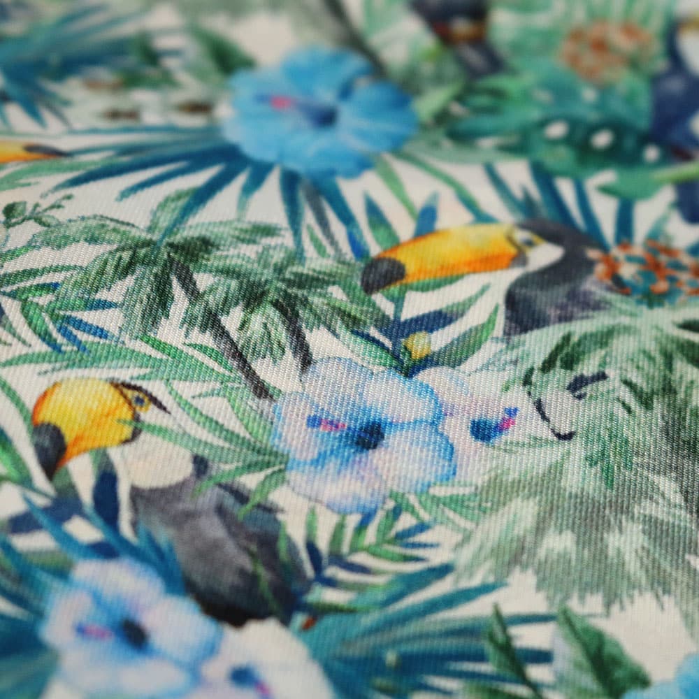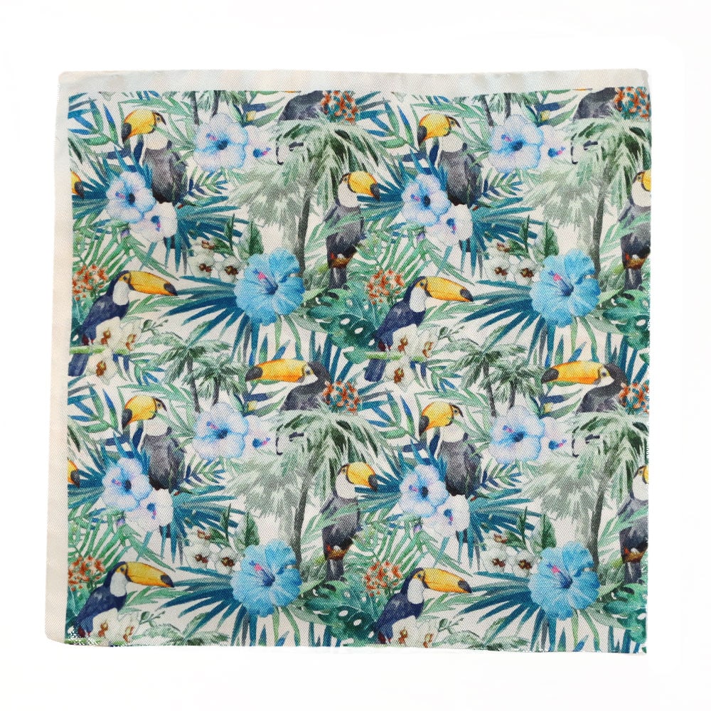 Amanda Christensen Tropical Pocket Square, featuring a silk fabric with printed tropical graphics. Add this pocket square to one of our suits or smart blazers for a complete and well appointed smart look.