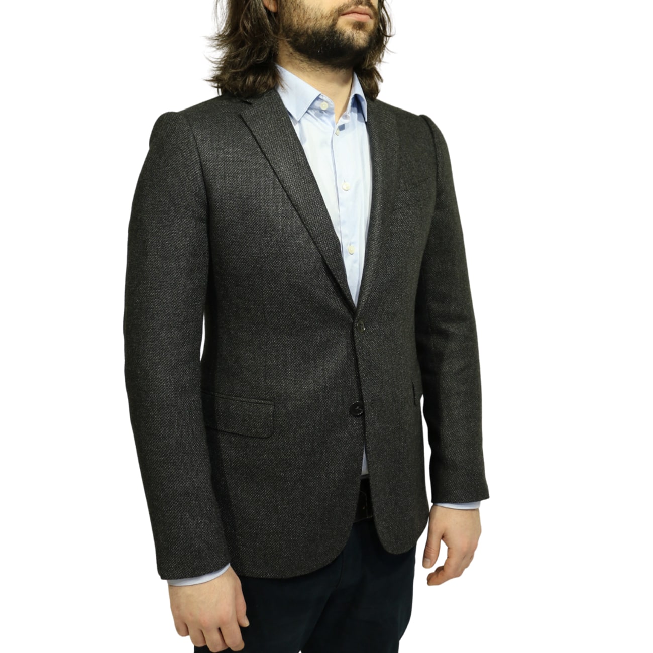 This Armani Collezioni charcoal smart jacket is cut for a slim fit and features notch lapels side vents, 4 button cuff. Made from a wool blend fabric, it is soft textured and comfortable to wear.