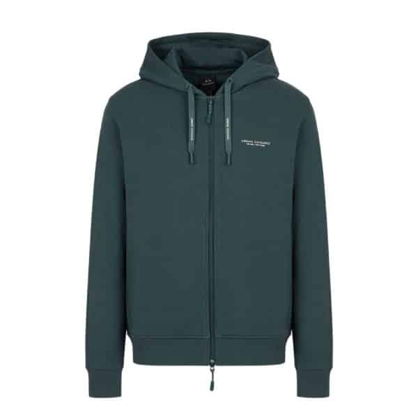 Made from cotton french terrycloth, this minimalist Armani Exchange zipped green hoodie can be worn anywhere. It is defined by a zip, logo drawstring hood and iconic front logo print.