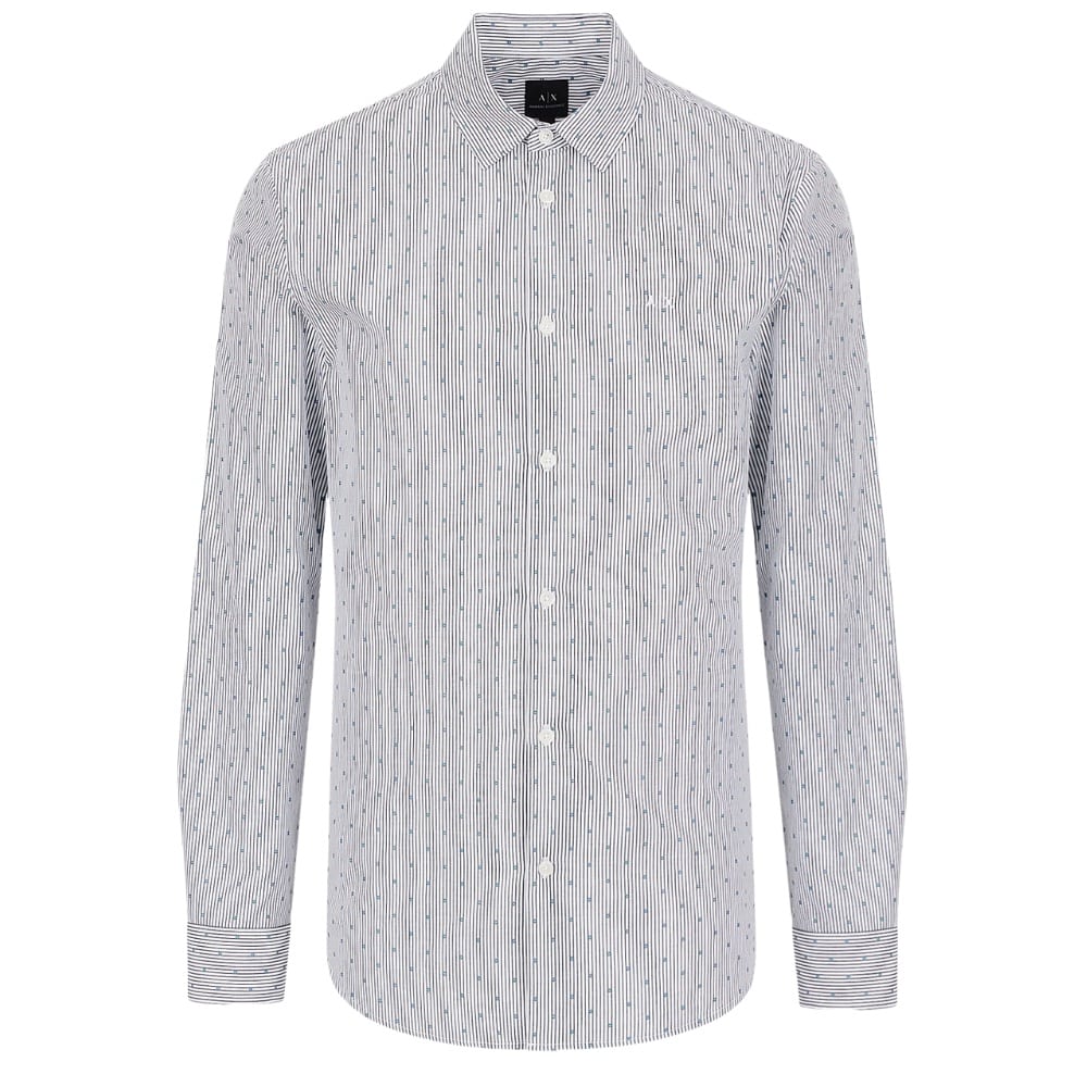 This Armani Exchange Blue Stripe and Dots in a regular fit with a classic neckline, and long sleeves with buttoned cuffs.