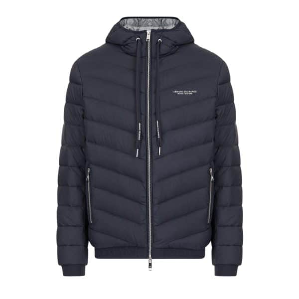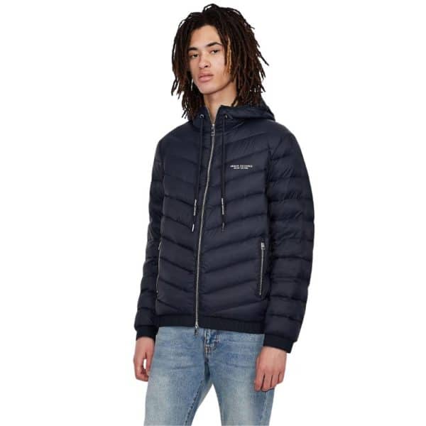 Keep warm with this Armani Exchange hooded navy puffer jacket with adjustable drawstrings. Designed from down feather for extra insulation, full zip closure, elasticated sleeve and hemline with imprinted logo for that comfortable fit.