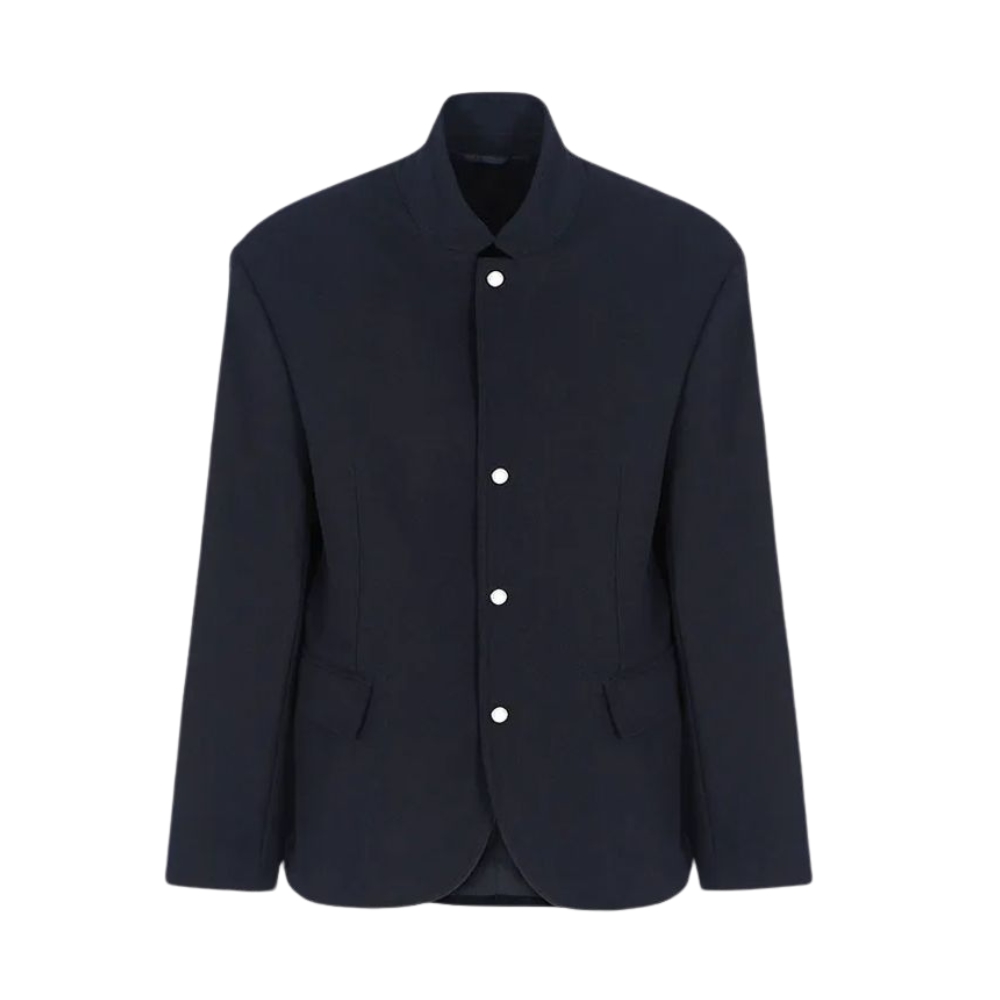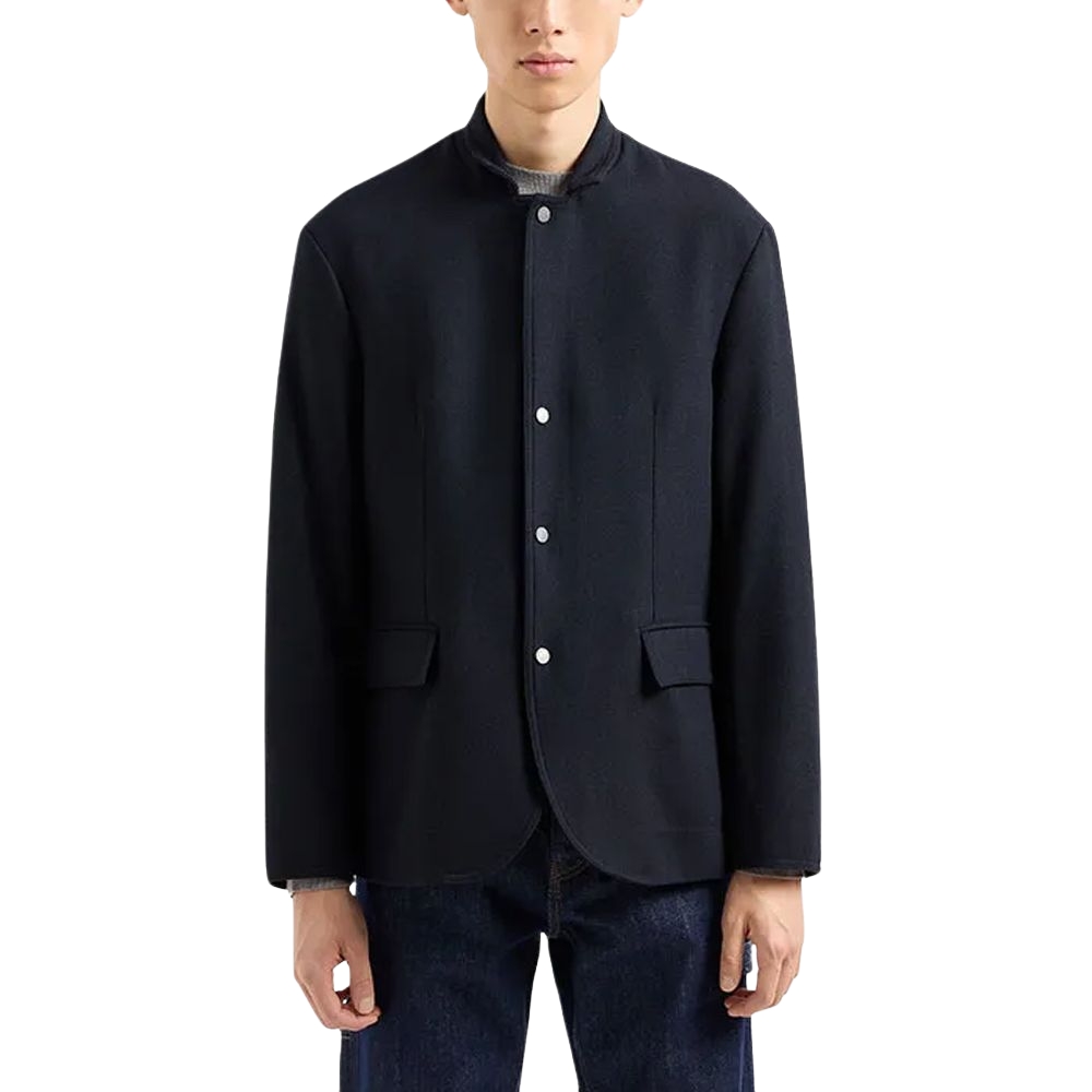 This Armani Exchange wool and polyester jacket features a Nehru collar with both studded and a hidden zip fastening ideal for the autumnal weather.