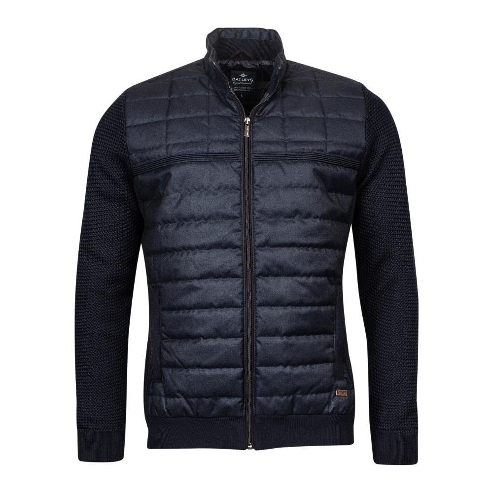 The Baileys navy hybrid jacket is a premium option perfect for all seasons. Expertly designed with a quilted front and knitted cotton back and sleeves, the hybrid is set to offer essential warmth and a super comfortable fit. Featuring a full zip fastening, stand up collar and ribbed trims.