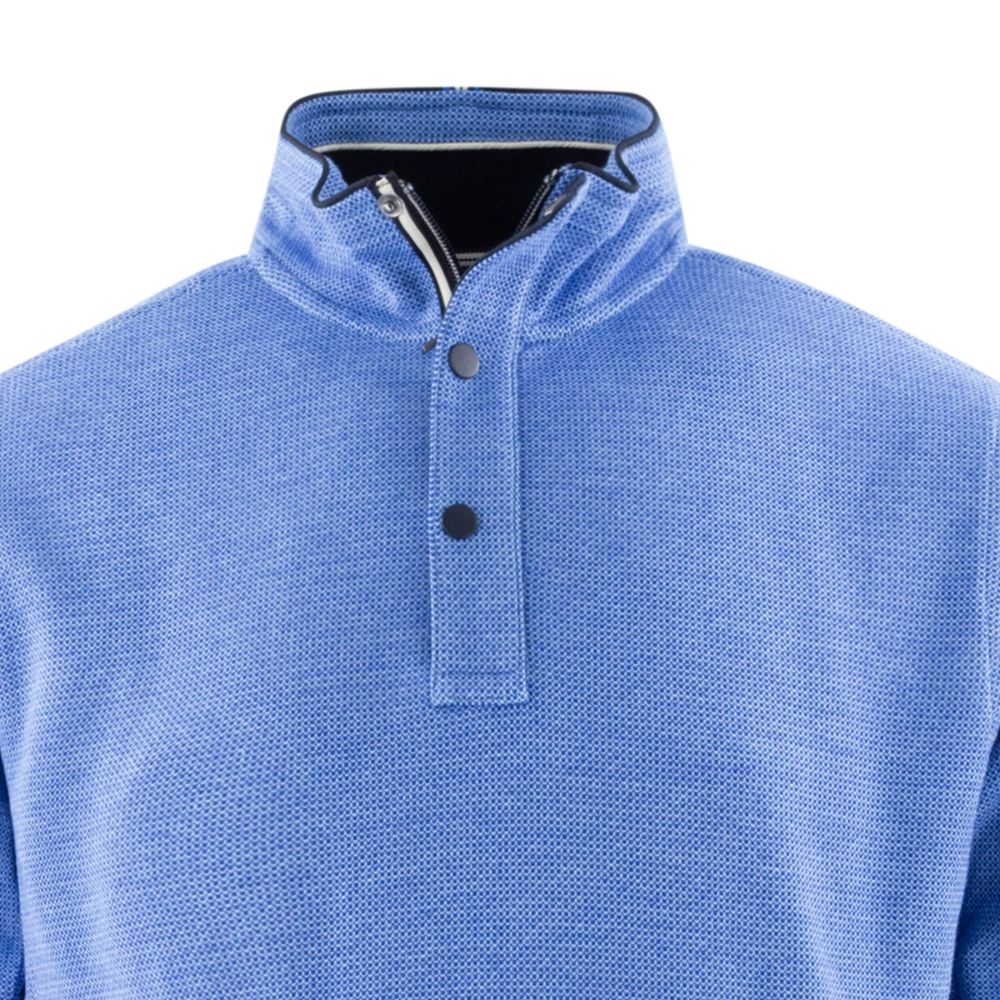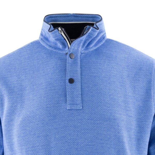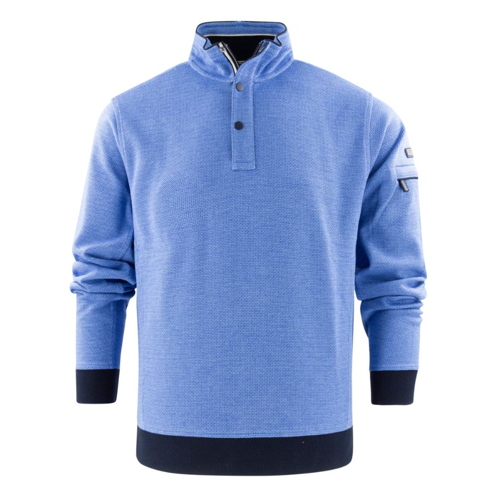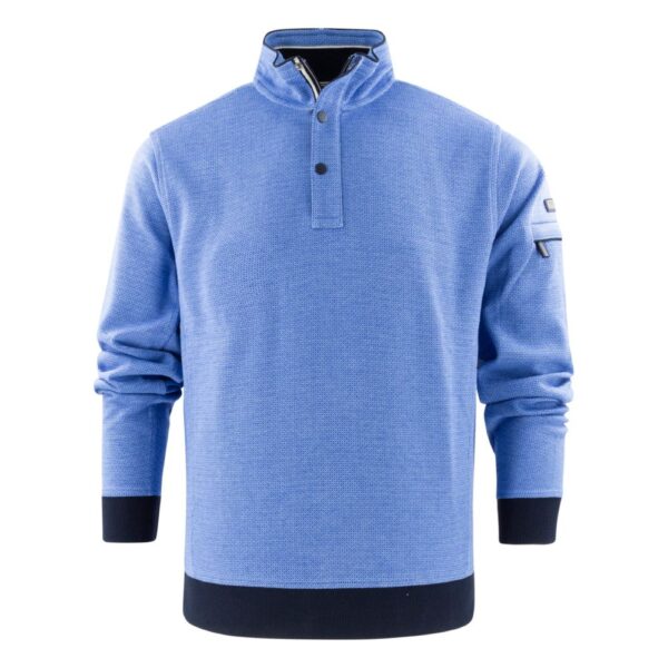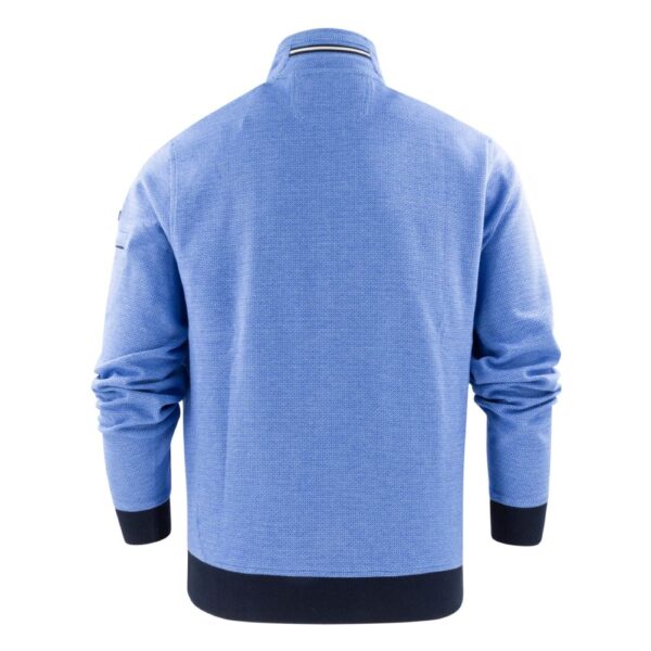 Vintage knitted light blue waffle half zip jumper by Baileys showcases a subtle brown leather patch on the left bottom. A classic and beautifully crafted half-zip, button and cotton with a unique texture.