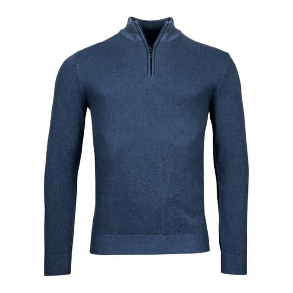 Vintage knitted blue waffle half zip jumper by Baileys showcases a subtle brown leather patch on the left bottom. A classic and beautifully crafted half-zip cotton with a unique texture.