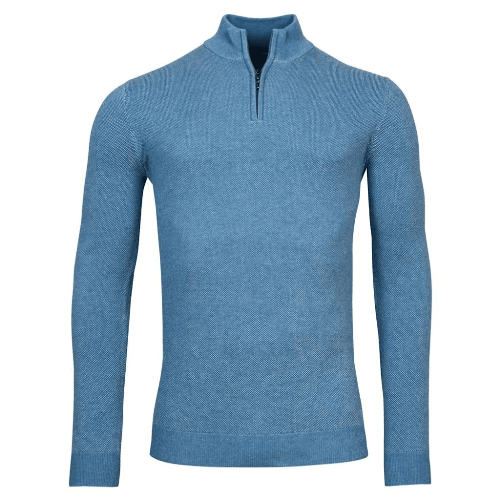 Vintage knitted blue waffle half zip jumper by Baileys showcases a subtle brown leather patch on the left bottom. A classic and beautifully crafted half-zip cotton with a unique texture.