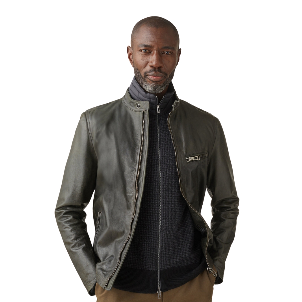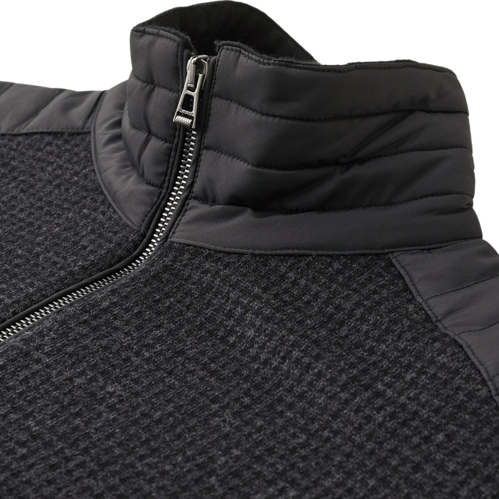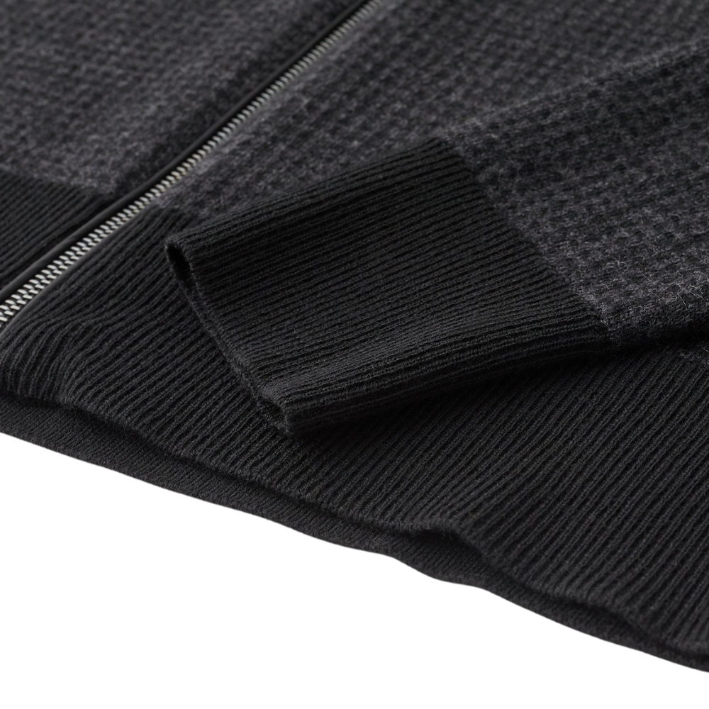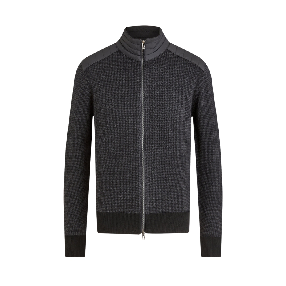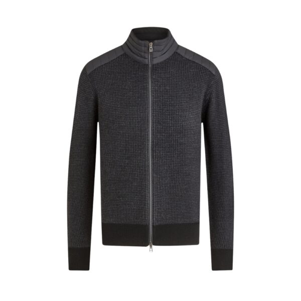 Looking for a truly versatile layer? The Kelby zip cardigan in black/charcoal has you covered. Wear it open as a light outer layer or zipped up through its channel-quilted stand collar. Crafted from black virgin merino wool, it’s built to see you through the seasons.