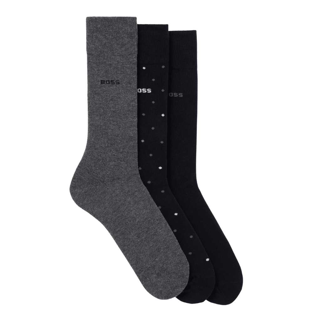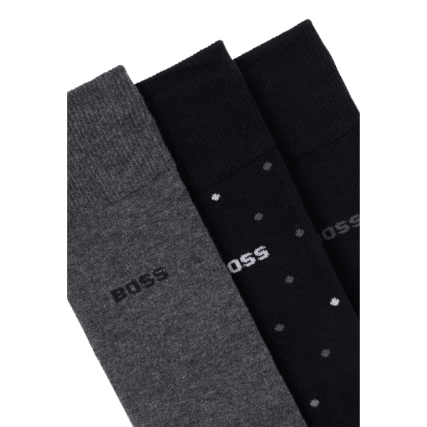 Three pairs of regular length socks by BOSS, crafted in a cotton-rich blend with logo details and presented in a gift box.