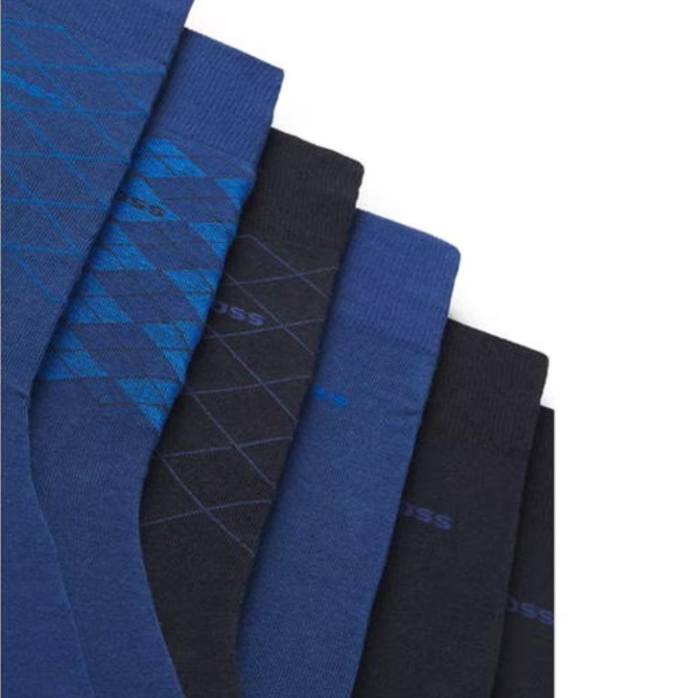 Six pairs of plain and patterned branded socks cut to a regular length in a cotton-rich blend by BOSS.