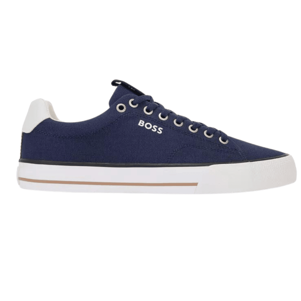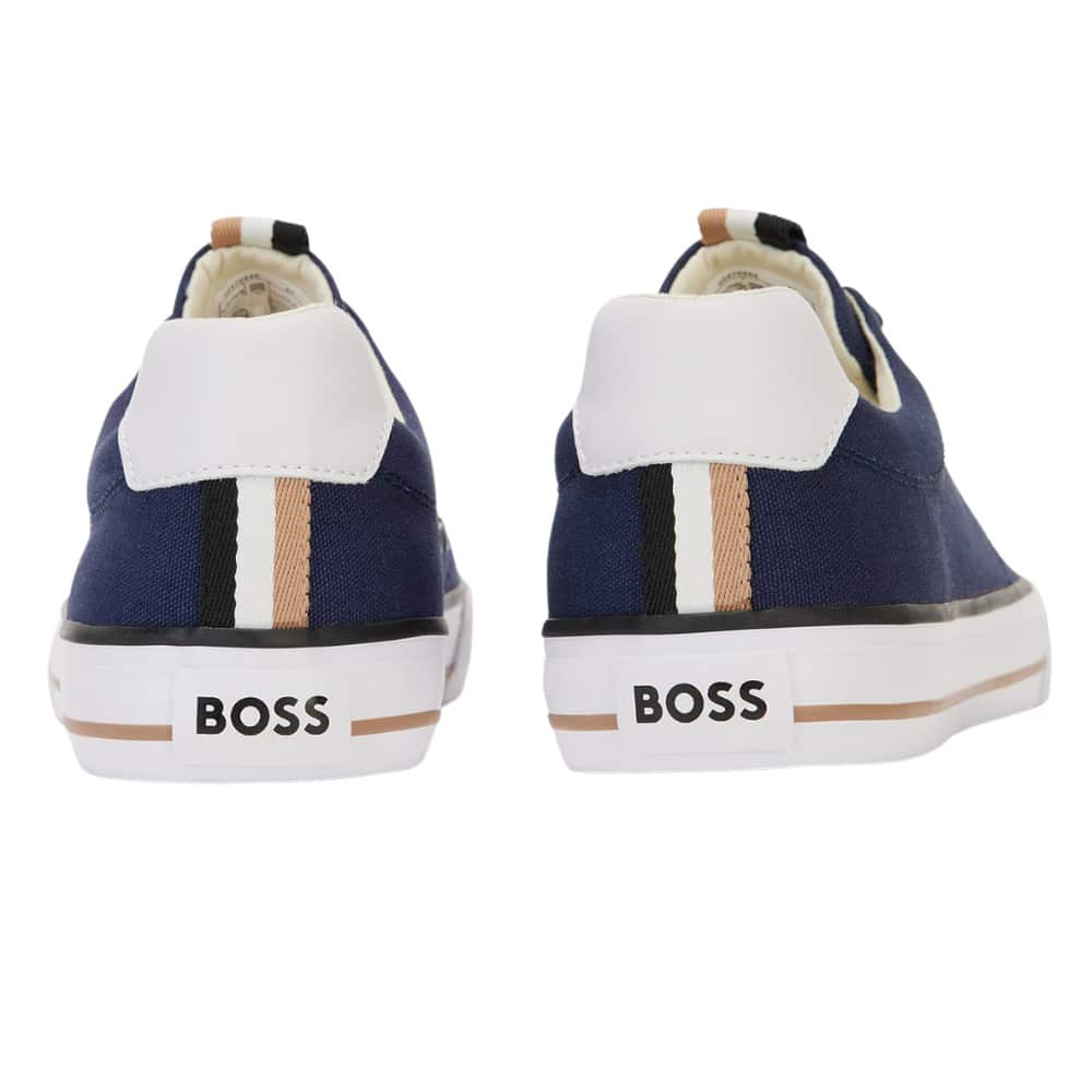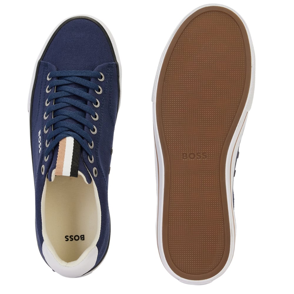 BOSS Aiden Dark Blue Cotton-Canvas Trainers with Signature Strip trim with a low profile featuring a contrast logo at the side panel, these lace-up trainers are crafted with cotton-canvas uppers and set on a vulcanised rubber outsole. BOSS branding and a signature-stripe trim give this pair a distinctive touch.