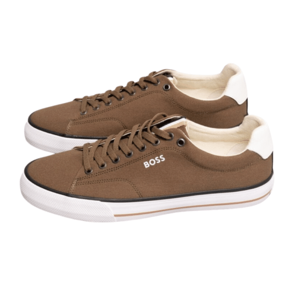BOSS Aiden Open Beige Cotton-Canvas Trainers with Signature Strip trim with a low profile featuring a contrast logo at the side panel, these lace-up trainers are crafted with cotton-canvas uppers and set on a vulcanised rubber outsole. BOSS branding and a signature-stripe trim give this pair a distinctive touch.