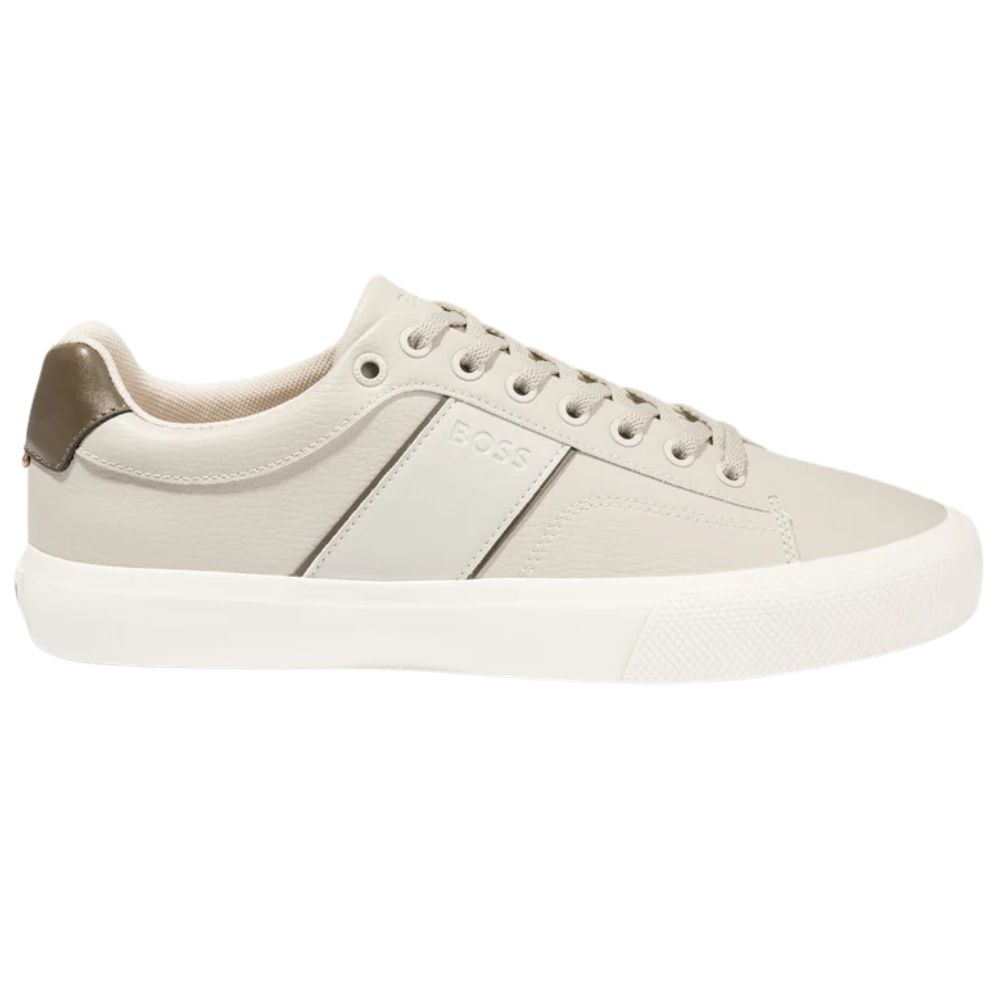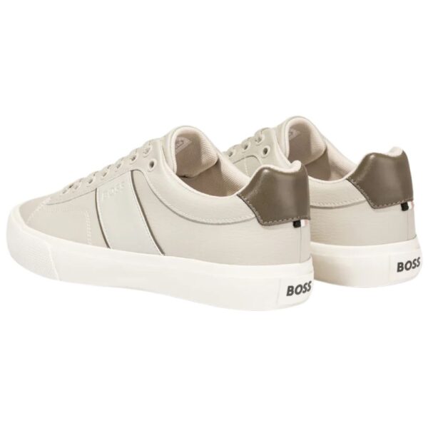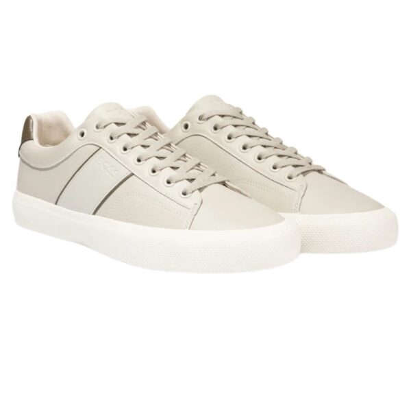 Sporty Beige trainers with piping and debossed branding by BOSS. This pair is crafted in synthetic coated fabric with grained and plain finishes. Synthetic coated fabric, sometimes referred to as faux leather, is a fabric designed to resemble real leather, and/or display a matte, glossy, smooth, or textured, coated appearance.