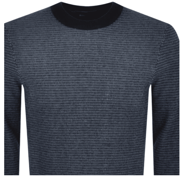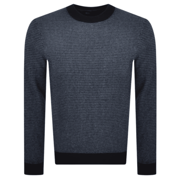 This BOSS Avobano Knit Jumper In Navy. An all over textured two tone knitted design in navy and blue with a ribbed crew neck and ribbed cuffs on the long sleeves and also a stretch ribbed waistband which are all in navy. The signature BOSS pinch tag logo is woven into the left side seam in black and orange. Top stitching in navy.