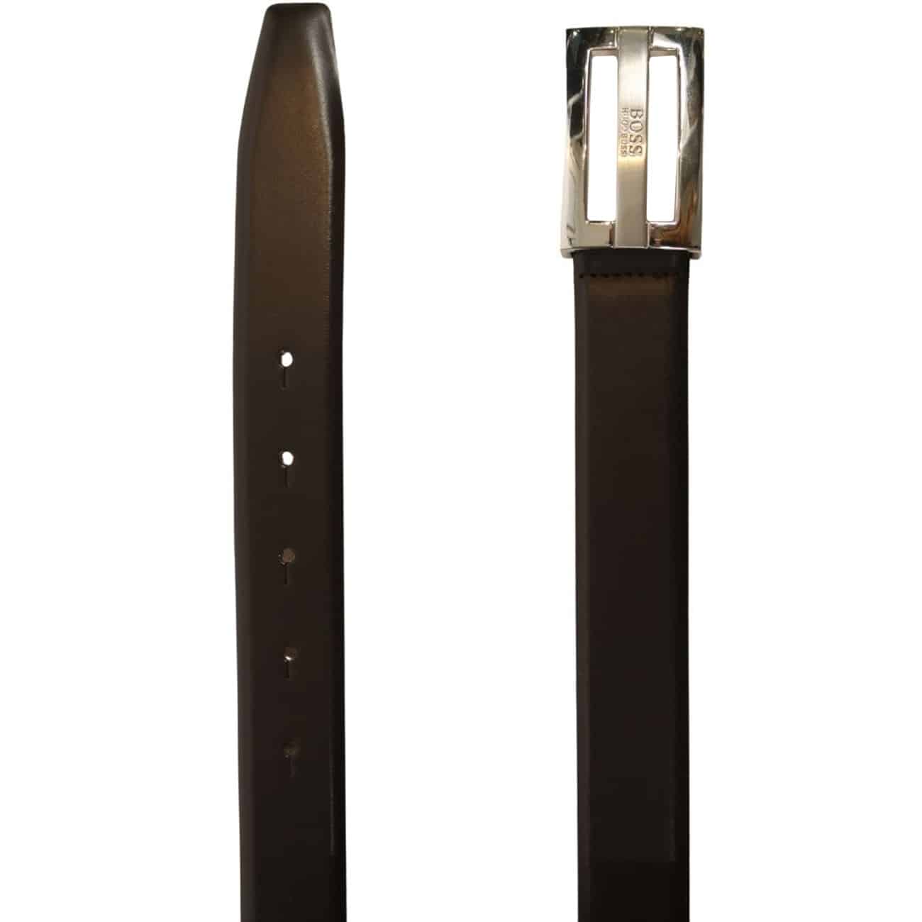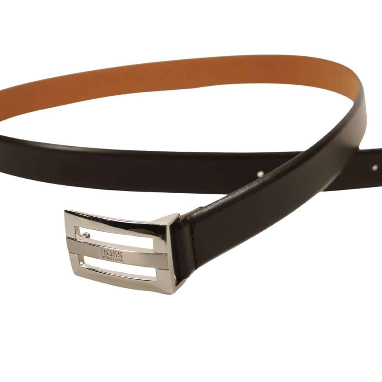 The Bastian leather belt black by BOSS menswear is an exquisite slim formal five hole belt with engraved Hugo Boss logo on the centre of the high shine press stud buckle. A smart business belt with a touch of class.