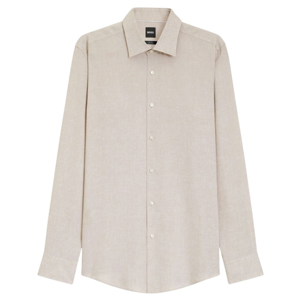 This regular fit beige linen shirt by BOSS menswear featuring a mandarin collar that gives you a versatile look right at home with your wardrobe favourites, or worn with our selection of smart and casual pieces.