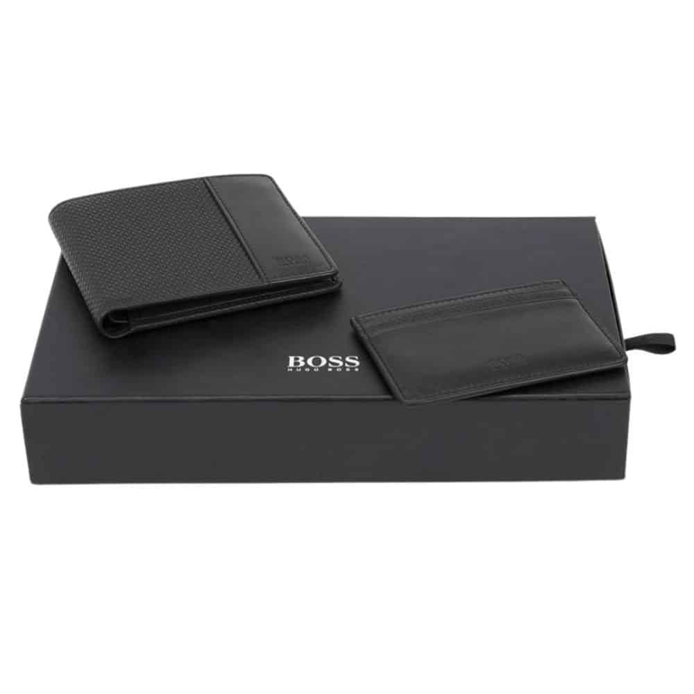A refined accessory set by BOSS Menswear, presented in a branded box for easy gifting. This elegant combination features a card holder and a matching billfold leather wallet. Each item in this duo is detailed with a BOSS logo.