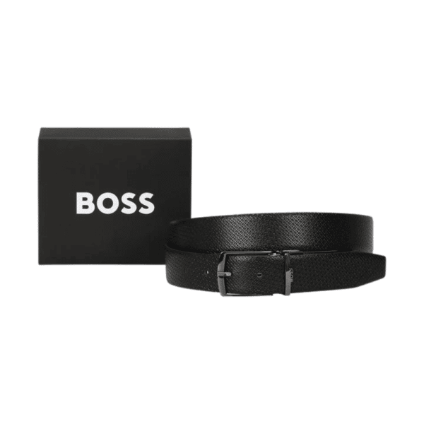 Men’s BOSS boxed leather reversible belt – 1 side in embossed black and the other in plain dark chocolate brown.