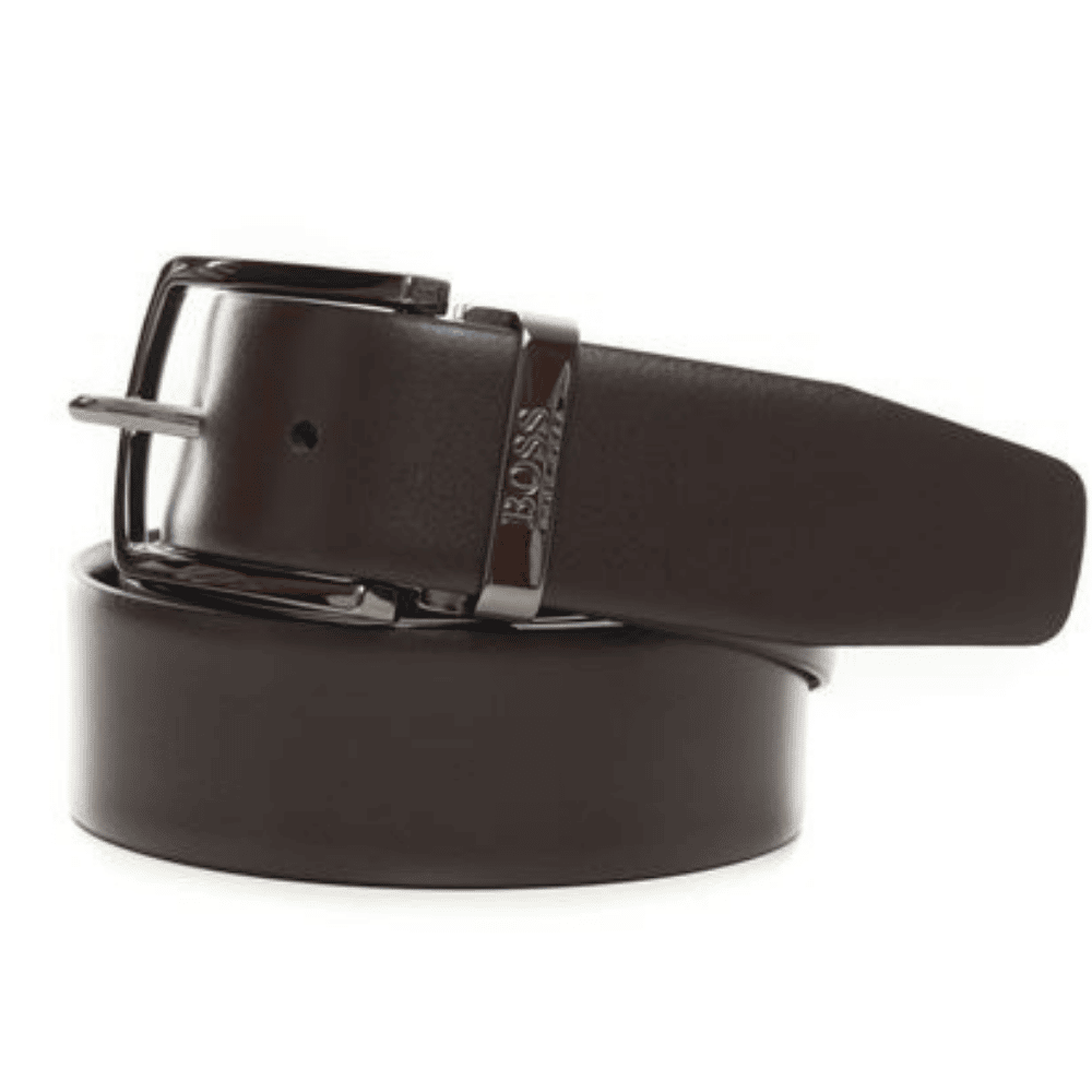 An elegant belt by BOSS menswear, designed for business and casual looks alike. Securing with a logo-trimmed pin buckle in Black/Silver, this belt is crafted in leather with a vegetable-tanning process for enhanced character. The belt has a reversible feature allowing you to wear either a black or brown colour, adjustable feature, very practical and useful for travel purpose.
