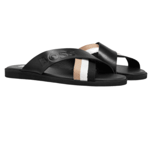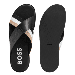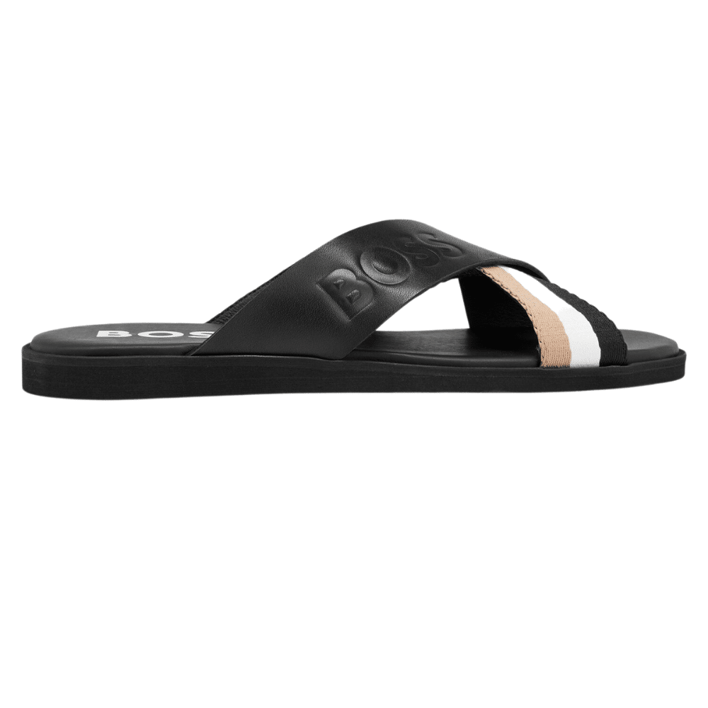 BOSS Black Refined sliders in brush-off leather with a tonal logo and signature-stripe detailing.