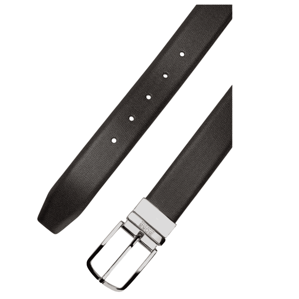 A timeless belt by BOSS, expertly crafted in black smooth leather one side and structured on the other. Detailed with contrast edging and a chiselled tip, this 3.5cm-width belt secures with a pin buckle in bright chrome finish with softly rounded corners. BOSS logo lettering on the buckle at the keeper adds a refined finish to this accessory. For the best fit, we advise to order a belt one size larger than your waist size